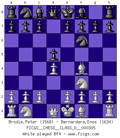 Last move : Kf8 2026 February 13 16:27:45 White clock - 11 days 09:48:19 Black clock - 91 days 13:22:04 [Event "FICGS__CHESS__CLASS_D__000305"] [Site "FICGS"] [Date "2025.08.02"] [Round "1"] [White "Brodie,Peter"] [Black "Bernardara,Enos"] [Result "*"] [WhiteElo "1568"] [BlackElo "1634"] 1.Nf3 d5 2.d4 Nf6 3.Bf4 e6 4.Nc3 Bb4 5.Bd2 O-O 6.e3 c5 7.dxc5 Bxc5 8.Be2 Nc6 9.O-O a6 10.a3 b5 11.b4 Bd6 12.Bd3 Bb7 13.Qe2 Re8 14.e4 dxe4 15.Bxe4 Nxe4 16.Nxe4 Be7 17.Qd3 h6 18.Qxd8 Raxd8 19.Rad1 Nb8 20.Bc3 Bxe4 21.Rxd8 Rxd8 22.Be5 Bxc2 23.Nd4 Be4 24.Bxb8 Rxb8 25.f3 Bd5 26.Rc1 Bd6 27.Nc6 Bxc6 28.Rxc6 Be5 29.Rxa6 Bd4+ 30.Kf1 Rb6 31.Rxb6 Bxb6 32.Ke2 Bd4 33.Kd3 Bb2 34.Kc2 Bxa3 35.Kb3 Bc1 36.Kc3 Be3 37.g4 Kf8 38.* Follow this game move after move (download)Place the contents of the Chess box in a hat, shake them up vigorously, pour them on the board from a height of two feet, and you get the style of Steinitz. (H. E. Bird) Wer der Ansicht ist, daß alle Schachspieler verrückt sind, wird durch Studium des Lebens von Emil Josef Diemer nicht auf andere Gedanken kommen. (Hans Ree) El Ajedrez es un invernadero donde los frutos del carácter pueden madurar mas completamente que en la vida. (Edward Morgan Foster) Les échecs, c'est l'art d'analyser. (Mikhail Botvinnik) Chess is as much a mystery as women. (Purdy)