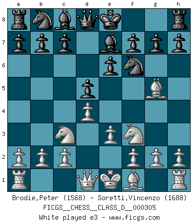 Last move : 1-0 2025 November 2 17:53:39 [Event "FICGS__CHESS__CLASS_D__000305"] [Site "FICGS"] [Date "2025.08.02"] [Round "1"] [White "Brodie,Peter"] [Black "Soretti,Vincenzo"] [Result "1-0"] [WhiteElo "1568"] [BlackElo "1688"] 1.Nc3 d5 2.d4 Nf6 3.Nf3 e6 4.Bg5 Be7 5.e3 O-O 6.Be2 Nc6 7.O-O a6 8.h3 Ne4 9.Bxe7 Qxe7 10.Nxe4 dxe4 11.Ne5 Nxe5 12.dxe5 Qg5 13.Bg4 Rd8 14.Qe2 Qxe5 15.c3 f5 16.f4 Qf6 17.Bh5 g6 18.Bxg6 hxg6 19.Rad1 Bd7 20.Rd4 c5 21.R4d1 b5 22.Rd2 c4 23.Rfd1 Qe7 24.Rd6 Kf7 25.Qd2 Ra7 26.Qd4 Rc7 27.Qb6 Rc6 28.Rxc6 1-0 Follow this game move after move (download)Daring ideas are like Chess men moved forward. They may be beaten, but they may start a winning game. (Johann Wolfgang von Goethe) Die Partien sind immer verschieden, die Interviews immer die gleichen. (Garry Kasparov) Cuando tu casa esta en llamas, no puedes ser molestado por tus vecinos. O, como decinos en Ajedrez, si tu Rey esta bajo ataque, no te preocupa perder un Peón del lado de la Reina. (Gary Kasparov) Les Echecs, c'est l'art de la guerre sans les charniers, c'est la résurrection des morts tombés au champ d'honneur, l'espoir perpétuel, la suprématie de l'intelligence sur la force, la culture de l'esprit. (F. Szpiner) The human is the only animal species whose members are able to talk themselves into difficulties that would not otherwise exist. (Wendell Johnson)