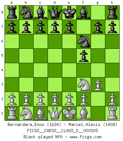 Last move : 0-1 2025 November 26 10:11:43 [Event "FICGS__CHESS__CLASS_D__000305"] [Site "FICGS"] [Date "2025.08.02"] [Round "1"] [White "Bernardara,Enos"] [Black "Marcel,Alexis"] [Result "0-1"] [WhiteElo "1634"] [BlackElo "1408"] 1.Nf3 f5 2.g3 Nf6 3.Bg2 g6 4.O-O Bg7 5.c4 O-O 6.Nc3 d6 7.d4 c6 8.Bg5 Nbd7 9.Qc2 Qe8 10.Rfe1 e5 11.dxe5 Nxe5 12.b3 Be6 13.Rad1 h6 14.Bc1 Rd8 15.e4 Nxf3+ 16.Bxf3 fxe4 17.Nxe4 Nxe4 18.Bxe4 Bh3 19.Bxg6 Qd7 20.Bh7+ Kh8 21.Bg6 Qg4 22.Re3 Rf6 23.Bd3 Rdf8 24.Rd2 h5 25.Bf1 Kg8 26.Bxh3 Qxh3 27.Bb2 R6f7 28.Bxg7 Rxg7 29.Rxd6 h4 30.Rh6 hxg3 31.Rxh3 gxf2+ 32.Kf1 Rg1+ 33.Ke2 f1Q+ 34.Kd2 Rg2+ 35.Kc3 Rxc2+ 36.Kxc2 Rf2+ 37.Kc3 Qa1+ 38.Kb4 Qxa2 39.Rhg3+ Kf7 40.Rh3 a5+ 41.Kc3 Qd2+ 0-1 Follow this game move after move (download)The battle for the ultimate truth will never be won. And that's why Chess is so fascinating. (Hans Kmoch) Um dein Spiel zu verbessern musst du zuallererst das Endspiel studieren, denn diese kann unabhängig studiert werden. Die Eröffnung und das Mittelspiel müssen immer in Bezug gesetzt werden zum Endspiel. (José Raúl Capablanca) El Ajedrez lo es todo: arte, ciencia y deporte. (Anatoly Karpov) Si rien de grave n'est détecté lors de l'analyse d'une position, on joue alors le coup. Seconde règle de Blumenfeld. I've never seen so many men wasted so badly. (Blondie in The Good, The Bad and The Ugly)