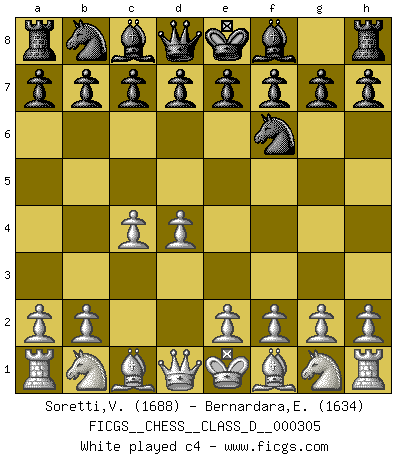 Last move : 1-0 2026 January 11 18:8:5 [Event "FICGS__CHESS__CLASS_D__000305"] [Site "FICGS"] [Date "2025.08.02"] [Round "1"] [White "Soretti,Vincenzo"] [Black "Bernardara,Enos"] [Result "1-0"] [WhiteElo "1688"] [BlackElo "1634"] 1.d4 Nf6 2.c4 g6 3.Nc3 Bg7 4.Nf3 O-O 5.e4 d6 6.Be2 b6 7.O-O Bb7 8.h3 Nbd7 9.Qc2 e5 10.d5 a6 11.Be3 c5 12.Qd2 Re8 13.Bg5 Qc7 14.a4 Reb8 15.b3 Re8 16.Nh2 Rec8 17.Ng4 Nxg4 18.Bxg4 f6 19.Be6+ Kh8 20.Bh6 Rd8 21.h4 Nf8 22.Bxg7+ Kxg7 23.Bh3 Bc8 24.Bxc8 Qxc8 25.Qe2 f5 26.exf5 Qxf5 27.Ne4 h5 28.Ng3 Qf7 29.Rad1 Qf4 30.Qe4 Nd7 31.Rd3 Nf6 32.Qxf4 exf4 33.Ne2 Ng4 34.Nxf4 Rd7 35.Ne6+ Kg8 36.f4 Rf7 37.g3 a5 38.Re1 Nf6 39.Ng5 R7f8 40.Re6 Kg7 41.Rxd6 Rfe8 42.Rxb6 Nd7 43.Rb7 Re7 44.Ne6+ Kf6 45.Re3 Kf7 46.Kf2 Kf6 47.Nxc5 Rxe3 48.Nxd7+ Kf5 49.Kxe3 Kg4 50.Kf2 Kf5 51.Kf3 Re8 52.Ne5 Rf8 53.c5 1-0 Follow this game move after move (download)If you aren't afraid of Spassky, then I have removed the element of money. (Jim Slater) Schach verlangt totale Konzentration. (Robert James Fischer) Siempre es mejor sacrificar los hombres de tu oponente. (Savielly Tartakower) La vérité est comme le meilleur coup aux échecs : elle existe, mais il faut la chercher. (Arturo Perez-Reverte) When you stop learning you start dying. (Scott Adams)