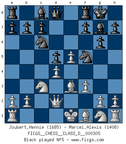 Last move : 1-0 2025 October 30 23:59:36 [Event "FICGS__CHESS__CLASS_D__000305"] [Site "FICGS"] [Date "2025.08.02"] [Round "1"] [White "Joubert,Hennie"] [Black "Marcel,Alexis"] [Result "1-0"] [WhiteElo "1685"] [BlackElo "1408"] 1.e4 g6 2.d4 Bg7 3.c4 e6 4.Nc3 Ne7 5.f3 O-O 6.Be3 d5 7.cxd5 exd5 8.e5 Nbc6 9.Qd2 Nf5 10.Bf2 Be6 11.Bb5 a6 12.Bxc6 bxc6 13.Rc1 Qd7 14.Na4 Rfb8 15.Nc5 Qc8 16.b3 Bf8 17.Nxe6 Qxe6 18.Ne2 Rb6 19.O-O a5 20.Nc3 Bb4 21.Qd3 Qe7 22.Na4 Rb5 23.Rxc6 R5b8 24.Rfc1 Ra7 25.Qc2 Ba3 26.Rxc7 Rxc7 27.Qxc7 Qb4 28.Rd1 Ne7 29.Be1 Qb7 30.Qxb7 Rxb7 31.Bxa5 Nc6 32.Be1 Rb4 33.Bxb4 Nxb4 34.Rd2 Bc1 35.Re2 Nc6 36.Rc2 Be3+ 37.Kf1 Nxd4 38.Rc8+ Kg7 39.Rd8 Ne6 40.Rxd5 1-0 Follow this game move after move (download)The hardest game to win is a won game. (Emanuel Lasker) Karpov ist ein Museumsstück. (Garry Kasparov) El tablero es el mundo, las piezas es el fenomeno del universo, las reglas del juego son lo que llamamos leyes de la naturaleza y el jugador del lado opuesto, se encuentra oculto a nuestra vista. (Thomas Huxley) Les échecs sont un jeu terrible. Si vous n'avez pas le centre, votre adversaire a une position plus libre. Par contre, si vous avez le centre, alors vous avez vraiment quelque chose pour laquelle vous inquiéter ! (Siegbert Tarrasch) The modern world has divided itself into Conservatives and Progressives. The business of Progressives is to go on making mistakes. The business of the Conservatives is to prevent the mistakes from being corrected. (G.K. Chesterton)