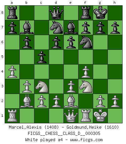 Last move : 1-0 2025 December 21 18:7:17 [Event "FICGS__CHESS__CLASS_D__000305"] [Site "FICGS"] [Date "2025.08.02"] [Round "1"] [White "Marcel,Alexis"] [Black "Goldmund,Heike"] [Result "1-0"] [WhiteElo "1408"] [BlackElo "1610"] 1.f4 Nf6 2.Nf3 b6 3.e3 Bb7 4.b3 e6 5.Bb2 c5 6.Be2 d6 7.O-O Be7 8.Nc3 O-O 9.Qe1 Nbd7 10.a4 Qc7 11.Bd3 Rfe8 12.Ne2 h6 13.Ng3 a6 14.h3 Bf8 15.Nh1 e5 16.fxe5 Nxe5 17.Nxe5 dxe5 18.Nf2 Qc6 19.e4 Rad8 20.Qe2 Rb8 21.Ng4 Nxe4 22.Kh2 Ng5 23.Qf2 e4 24.Bc4 Qd6+ 25.Kg1 Qd7 26.Nxh6+ gxh6 27.Qf6 Kh7 28.Qh8+ Kg6 29.Rf6+ Kh5 30.Rxh6+ Bxh6 31.g4+ Kg6 32.Qf6+ Kh7 33.Rf1 Rf8 34.Rf5 Nxh3+ 35.Kf1 Ng5 36.Rxg5 Rg8 37.Qf5+ Rg6 38.Qxd7 Rxg5 39.Qxf7+ Bg7 40.Bxg7 Rxg7 41.Qf5+ Kh8 42.Qh5+ Rh7 43.Qe5+ Rg7 44.Qxb8+ Kh7 45.Bg8+ Kg6 46.Qd6+ Kg5 47.Qe5+ Kxg4 48.Qxg7+ Kf4 49.Qxb7 1-0 Follow this game move after move (download)Chess is played with the mind and not with the hands ! (Renaud and Kahn) Es gibt nur zwei wahre Schachgenies - das andere war Wilhelm Steinitz, der Weltmeister von 1872 bis 1894. (Robert James Fischer) Solo los afeminados hacen el Enroque. (Rob Sillars) Le plus grand jeu de l'esprit jamais inventé, plus vous l'apprenez, plus vous y prenez du plaisir. (Garry Kasparov) At work, the authority of a person is inversely proportional to the number of pens that person is carrying. (Dan Rotaru)