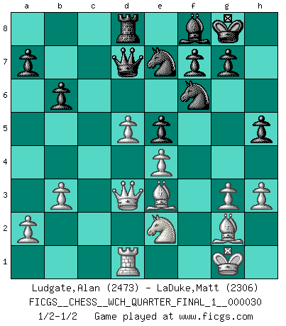 Last move : 1/2-1/2 2025 September 18 5:44:43 [Event "FICGS__CHESS__WCH_QUARTER_FINAL_1__000030"] [Site "FICGS"] [Date "2025.08.03"] [Round "1"] [White "Ludgate,Alan"] [Black "LaDuke,Matt"] [Result "1/2-1/2"] [WhiteElo "2473"] [BlackElo "2306"] 1.d4 Nf6 2.c4 e6 3.Nf3 d5 4.g3 Bb4+ 5.Bd2 Be7 6.Bg2 O-O 7.O-O c6 8.Qc2 b6 9.Ne5 Bb7 10.Bf4 Nbd7 11.Rd1 Nh5 12.Bd2 Nhf6 13.cxd5 cxd5 14.Nc6 Bxc6 15.Qxc6 Rc8 16.Qb5 Ne8 17.Qd3 Nd6 18.Nc3 Nf6 19.b3 Qd7 20.f3 Nf5 21.e3 Rfd8 22.Ne2 Bf8 23.Rac1 h5 24.Rxc8 Rxc8 25.h3 Ne7 26.e4 dxe4 27.fxe4 e5 28.Be3 Rd8 29.d5 1/2-1/2 Follow this game move after move (download)Modern Chess is too much concerned with things like Pawn structure. Forget it, Checkmate ends the game. (Nigel Short) Immer nach dem besten Zug zu suchen ist ziemlich unpraktisch. (Nigel Short) El Ajedrez tiene tanto misterio como las mujeres. (Purdy) Dieu déplace le joueur, et celui-ci la pièce. Quel Dieu derrière Dieu commence donc la trame ? Arturo Perez-Reverte (prix de littérature policière 1993). A bird doesn't sing because it has an answer, it sings because it has a song. (Maya Angelou)