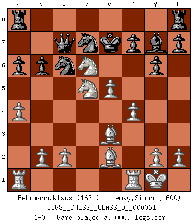 Last move : 1-0 2007 October 16 1:14:1 [Event "FICGS__CHESS__CLASS_D__000061"] [Site "FICGS"] [Date "2007.10.05"] [Round "1"] [White "Behrmann,Klaus"] [Black "Lemay,Simon"] [Result "1-0"] [WhiteElo "1671"] [BlackElo "1600"] 1.e4 c5 2.f4 Nc6 3.Nc3 e6 4.Nf3 b6 5.Be2 Bb7 6.O-O d6 7.d4 cxd4 8.Nxd4 Nf6 9.Be3 g6 10.a4 Bg7 11.Ndb5 d5 12.e5 Nd7 13.Nd6+ Ke7 14.Nxb7 Qc7 15.Nd6 a6 16.Qxd5 exd5 17.Nxd5+ 1-0 Sicilian : Grand Prix attack Kingside Castling by player White (move 6) Player White won this chess game. Follow this game move after move (download)A strong memory, concentration, imagination, and a strong will is required to become a great Chess player. (Bobby Fischer) Sie bekommen vielleicht den Eindruck, dass die Spitzenspieler überhaupt gar nicht so stark sind. Aber das stimmt nicht. Es ist eine Illusion. Mit einem Computer an der Seite ist es sehr leicht, Urteile zu fällen, aber wenn man alleine am Brett sitzt, sieht die Sache ganz anders aus. (Vladimir Kramnik) El Ajedrez es realmente noventa y nueve por ciento calculación. (Soltis) La conception d'un plan est le processus par lequel un joueur exploite les avantages de sa position tout en s'efforçant d'en réduire au minimum les inconvénients. Afin de garantir le succès, un plan doit toujours se fonder sur un diagnostic objectif des particularités d'une position. La conception d'un plan est d'autant plus difficile que la position est équilibrée, et grandement facilitée lorsqu'il n'existe qu'un seul plan susceptible de répondre aux exigences de la position. (Harry Golombek) Humor is by far the most significant activity of the human brain. (Edward De Bono)