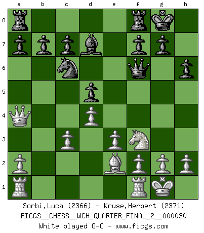 Last move : 1/2-1/2 2025 September 19 17:36:25 [Event "FICGS__CHESS__WCH_QUARTER_FINAL_2__000030"] [Site "FICGS"] [Date "2025.08.03"] [Round "6"] [White "Sorbi,Luca"] [Black "Kruse,Herbert"] [Result "1/2-1/2"] [WhiteElo "2366"] [BlackElo "2371"] 1.d4 Nf6 2.c4 e6 3.Nf3 d5 4.Nc3 Bb4 5.Bg5 h6 6.Bxf6 Qxf6 7.Qa4+ Nc6 8.e3 O-O 9.Be2 Bxc3+ 10.bxc3 Bd7 11.cxd5 exd5 12.O-O b6 13.Qb3 Be6 14.Qa4 Na5 15.Ne5 Rad8 16.Rae1 Rfe8 17.f4 Bf5 18.Bf3 Qd6 19.g4 Be6 20.g5 Bh3 21.Rf2 hxg5 22.fxg5 Qe7 23.Bg2 Bxg2 1/2-1/2 Follow this game move after move (download)Before the endgame, the Gods have placed the middle game. (Siegbert Tarrasch) Die jungen Leute sollen verstehen, dass sie noch etwas von mir lernen können und müssen. (Viktor Kortschnoi) Los libros de Ajedrez deben de usarse igual como usamos los anteojos: para mejorar la vista, aunque algunos jugadores los quieren usar como si ellos les otorgaran la vision. (José Raúl Capablanca) A ce moment-là, je menaçais de comprendre la position ! (Clément L'Heureux) Watch your thoughts; they become words. Watch your words; they become actions. Watch your actions; they become habits. Watch your habits; they become character. Watch your character; it becomes your destiny. (Frank Outlaw)