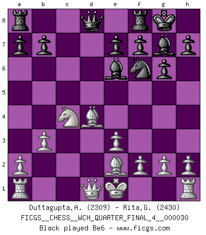 Last move : 1/2-1/2 2025 September 29 23:29:31 [Event "FICGS__CHESS__WCH_QUARTER_FINAL_4__000030"] [Site "FICGS"] [Date "2025.08.03"] [Round "8"] [White "Duttagupta,Aniruddha"] [Black "Rita,Giacomo"] [Result "1/2-1/2"] [WhiteElo "2309"] [BlackElo "2430"] 1.Nf3 Nf6 2.b3 c5 3.Bb2 Nc6 4.e3 g6 5.d4 cxd4 6.Nxd4 Bg7 7.c4 O-O 8.Be2 Nxd4 9.Bxd4 d5 10.Nd2 dxc4 11.Nxc4 Be6 12.O-O Rc8 13.Rc1 b6 14.Ne5 Qd6 15.Nf3 Ne4 16.Bxg7 Qxd1 17.Rfxd1 Kxg7 18.Nd4 Bd7 19.Bc4 Rfd8 20.f3 Nd6 21.Ba6 Rxc1 22.Rxc1 e5 23.Nc2 Bc8 24.Nb4 Bxa6 25.Nxa6 Ne8 26.Rc2 Kf6 27.h4 h5 28.e4 Ke6 29.Kf2 f5 30.Ke3 1/2-1/2 Follow this game move after move (download)Chess is a part of culture and if a culture is declining then Chess too will decline. (Mikhail Botvinnik) Der Partner hat auch seine Existenzberechtigung. (Savielly Grigorievitsch Tartakower) De eso se trata el Ajedrez. Un día le das una lección a tu oponente y al día siguiente el te da una a tí. (Bobby Fischer) Avec des compensations pour le matériel en plus... (Anonyme) Over-the-board chess is the favorite of mortals, correspondence chess is the favorite of the gods. (Eduard Dyckhoff)