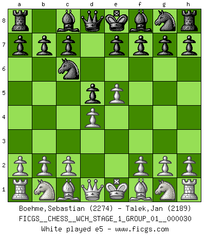 Last move : 1/2-1/2 2025 November 2 20:42:21 [Event "FICGS__CHESS__WCH_STAGE_1_GROUP_01__000030"] [Site "FICGS"] [Date "2025.08.03"] [Round "1"] [White "Boehme,Sebastian"] [Black "Talek,Jan"] [Result "1/2-1/2"] [WhiteElo "2274"] [BlackElo "2189"] 1.e4 Nc6 2.d4 d5 3.e5 Bf5 4.c3 e6 5.Nd2 f6 6.f4 g5 7.Qh5+ Kd7 8.Ndf3 gxf4 9.Bb5 Qe8 10.Qxe8+ Rxe8 11.Ne2 Be4 12.Bxf4 Bxf3 13.gxf3 Bh6 14.Bxh6 Nxh6 15.f4 a6 16.Ba4 Reg8 17.Kd2 Ke7 18.Bc2 Kf7 19.Rag1 Ng4 20.Rf1 Ne7 21.a4 Nh6 22.Rhg1 Rg4 23.Rxg4 Nxg4 24.h3 Nh6 25.Rg1 Nhf5 26.b4 b6 27.a5 Nh4 28.Rf1 h6 29.Bd3 Ra8 30.Kc2 Ng2 31.Kd2 Nh4 32.Rh1 Nc6 33.axb6 cxb6 34.Ra1 a5 35.Kc2 Rg8 36.Bb5 Na7 37.Bd3 Nc6 1/2-1/2 Follow this game move after move (download)Chess teaches you to control the initial excitement you feel when you see something that looks good and it trains you to think objectively when you're in trouble. (Stanley Kubrick) Ein typischer, sehr verbreiteter Gedankenschädling ist der, daß der betreffende Amateur von der Annanhme ausgeht, daß jeder einzelne Zug etwas zu leisten habe. (Aaron Nimzowitsch) Desconfianza es la característica mas necesaria de un jugador de Ajedrez. (Siegbert Tarrasch) Aucun coup ne doit être joué sans but. (Pedro Damiano) It's not the will to win, but the will to prepare to win that makes the difference. (Bear Bryant)