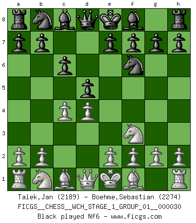 Last move : 1/2-1/2 2025 November 2 21:22:10 [Event "FICGS__CHESS__WCH_STAGE_1_GROUP_01__000030"] [Site "FICGS"] [Date "2025.08.03"] [Round "2"] [White "Talek,Jan"] [Black "Boehme,Sebastian"] [Result "1/2-1/2"] [WhiteElo "2189"] [BlackElo "2274"] 1.c4 c6 2.d4 d5 3.Nf3 Nf6 4.Nc3 e6 5.Bg5 dxc4 6.e4 b5 7.e5 h6 8.Bh4 g5 9.Nxg5 hxg5 10.Bxg5 Be7 11.exf6 Bxf6 12.Bxf6 Qxf6 13.g3 Bb7 14.Ne4 Qe7 15.Bg2 Na6 16.O-O O-O-O 17.h4 c5 18.a4 Rxd4 19.Qe2 b4 20.Rad1 Qc7 21.Ng5 Bxg2 22.Kxg2 Qc6+ 23.Kh2 f6 24.Qxe6+ Kb7 25.Qe7+ Qc7 26.Qxc7+ Nxc7 27.Nf7 Rg8 28.Rxd4 cxd4 29.Nd6+ Kc6 30.Nxc4 Kd5 31.Nd2 Ne6 32.Kg2 Nf4+ 33.Kf3 Nd3 34.b3 f5 35.h5 Ne5+ 36.Kg2 d3 37.Rh1 Kd4 38.Nb1 1/2-1/2 Follow this game move after move (download)Chess holds its master in its own bonds, shackling the mind and brain so that the inner freedom of the very strongest must suffer. (Albert Einstein) Rubinstein ist ein Turmendspiel, welches die Götter vor tausenden von Jahren begannen. (Savielly Grigorievitsch Tartakower) Haz el enroque temprano y seguido. (Rob Sillars) Le joueur d'Echecs qui veut atteindre le top est obligé de développer son propre credo créatif. Alexeï Stepanovicth Souétine. Il est facile d'écrire des livres ! Ce qui est difficile, c'est de jouer ! (Alexeï Stepanovicth Souétine) I live to kill Traxler counterattack. (Ilmars Cirulis)