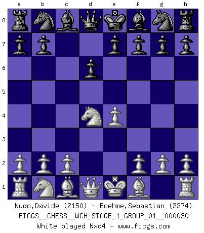 Last move : 1/2-1/2 2025 October 4 12:58:50 [Event "FICGS__CHESS__WCH_STAGE_1_GROUP_01__000030"] [Site "FICGS"] [Date "2025.08.03"] [Round "1"] [White "Nudo,Davide"] [Black "Boehme,Sebastian"] [Result "1/2-1/2"] [WhiteElo "2150"] [BlackElo "2274"] 1.e4 c5 2.Nf3 d6 3.d4 cxd4 4.Nxd4 Nf6 5.Nc3 a6 6.Bc4 e6 7.Bb3 Nbd7 8.f3 Nc5 9.Be3 Be7 10.Qd2 Bd7 11.g4 b5 12.a3 Rb8 13.g5 Nh5 14.Ba2 b4 15.axb4 Rxb4 16.Nb3 a5 17.Nxc5 dxc5 18.O-O-O Rb7 19.Nd5 exd5 20.Qxd5 Qb6 21.Qxf7+ Kd8 22.Rxd7+ Rxd7 23.Qxh5 a4 24.Bd5 Qb5 25.Qg4 a3 26.bxa3 c4 27.a4 Ba3+ 28.Kd2 c3+ 29.Ke1 Qb1+ 30.Kf2 Qxh1 31.Bb6+ Kc8 32.Bb7+ Kxb7 33.Qxd7+ 1/2-1/2 Follow this game move after move (download)We must make sure that Chess will not be like a dead language, very interesting, but for a very small group. (Sytze Faber) Vielleicht wirkt die Aura früherer Spieler glanzvoller als die der heutigen Spieler, aber das liegt daran, dass man kein Programm wie Fritz hatte, das einem all die Löcher in ihren Partien zeigt. (Vladimir Kramnik) Aunque la mayoría de la gente disfruta observar las partidas de los grandes Maestros de ataque, algunos de los jugadores mas notables en la historia han sido los jugadores silenciosos posicionales. Lentamente ellos te aplastan despojandote de tu espacio, congestionando tus piezas y dejandote virtualmente sin nada que hacer. (Yasser Seirawan) Mais n'est-ce pas déjà le limiter injurieusement que d'appeler les échecs un jeu? N'est-ce pas aussi une science, un art, ou quelque chose qui, comme le cercueil de Mahomet entre ciel et terre, est suspendu entre l'un et l'autre, et qui réunit un nombre incroyable de contraires ? (Stefan Zweig) Computers are like Old Testament gods; lots of rules and no mercy. (Joseph Campbell)