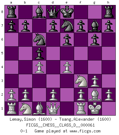 Last move : 0-1 2007 November 9 2:51:56 [Event "FICGS__CHESS__CLASS_D__000061"] [Site "FICGS"] [Date "2007.10.05"] [Round "1"] [White "Lemay,Simon"] [Black "Tsang,Alexander"] [Result "0-1"] [WhiteElo "1600"] [BlackElo "1600"] 1.Nf3 c5 2.g3 g6 3.Bg2 Bg7 4.O-O Nc6 5.c4 e6 6.e4 Nge7 0-1 Reti Opening Kingside Castling by player White (move 4) Player Black won this chess game. Follow this game move after move (download)Best by test: 1. e4 (Bobby Fischer) Du musst nicht gut spielen, es reicht, wenn du besser spielst als dein Gegner. (Anonymous) Todo se encuentra en un estado de flujo y esto incluye al mundo del Ajedrez. (Mikhail Botvinnik) Un journaliste : 'Vous préférez avoir une dame de plus sur l'échiquier ou au lit ?' Boris Spassky : 'Ca dépend de la position.' God is an atheist. (Unknown)