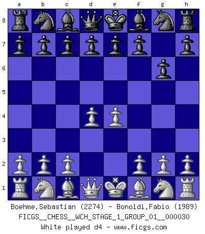 Last move : 1-0 2025 November 3 19:50:17 [Event "FICGS__CHESS__WCH_STAGE_1_GROUP_01__000030"] [Site "FICGS"] [Date "2025.08.03"] [Round "2"] [White "Boehme,Sebastian"] [Black "Bonoldi,Fabio"] [Result "1-0"] [WhiteElo "2274"] [BlackElo "1989"] 1.e4 g6 2.d4 Bg7 3.f4 d6 4.Nf3 a6 5.Nc3 b5 6.Bd3 Bb7 7.a4 b4 8.Ne2 Nd7 9.c3 bxc3 10.bxc3 c5 11.O-O Ngf6 12.e5 Nd5 13.Rb1 Qc8 14.Ng5 c4 15.Bc2 h6 16.Nxf7 Kxf7 17.e6+ Kxe6 18.f5+ Kf7 19.fxg6+ Ke8 20.Ng3 Bc6 21.Nf5 Bf6 22.Qf3 Rb8 23.Rxb8 Nxb8 24.Nxh6 Rf8 25.Qg3 1-0 Follow this game move after move (download)Chess is a foolish expedient for making idle people believe they are doing something very clever when they are only wasting their time. (George Bernard Shaw) Du musst Deinen Gegner in einen tiefen dunklen Wald führen wo 2+2=5 ist und wo der Weg, der wieder hinausführt, nur breit genug für einen ist. (Mikhail Nekhemyevich Tal) Sin errores no puede haber brillantez. (Emanuel Lasker) Avant la finale, les dieux ont créé le milieu de partie. (Tarrasch) Real knowledge is to know the extent of one's ignorance. (Confucius)