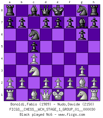 Last move : 0-1 2025 November 1 19:59:29 [Event "FICGS__CHESS__WCH_STAGE_1_GROUP_01__000030"] [Site "FICGS"] [Date "2025.08.03"] [Round "1"] [White "Bonoldi,Fabio"] [Black "Nudo,Davide"] [Result "0-1"] [WhiteElo "1989"] [BlackElo "2150"] 1.c4 c5 2.g3 g6 3.Bg2 Bg7 4.Nc3 Nc6 5.d3 e6 6.e4 Nge7 7.Nge2 O-O 8.O-O d6 9.Be3 Nd4 10.f4 a6 11.Qd2 Nec6 12.Rae1 Rb8 13.b3 b5 14.g4 b4 15.Nd1 Nxe2+ 16.Qxe2 Nd4 17.Qf2 f5 18.gxf5 exf5 19.Bc1 a5 20.Qg3 Bf6 21.exf5 Bh4 22.Qe3 Bxe1 23.Qxe1 Bxf5 24.Nf2 Qh4 25.Ne4 Qxe1 26.Rxe1 Bxe4 27.Bxe4 Rbe8 28.Kf2 Rf6 29.Kg3 Nf5+ 30.Kg4 Kf8 31.Bb2 Rf7 0-1 Follow this game move after move (download)I know people who have all the will in the world, but still can't play good Chess. (Bobby Fischer) Er war ein guter Schachspieler, aber ich kann Leute nicht ausstehen, die 'Heil Hitler' rufen (Über Alexander Aljechin). (Miguel Najdorf) Cuando veas una buena jugada, trata de encontrar otra mejor. (Emanuel Lasker) Vous savez, camarade Pachman, je n'éprouve pas de plaisir à être ministre, je jouerais plutôt aux échecs comme vous, ou alors ferais une révolution au Venezuela. (Che Guevara à Ludek Pachman, 'Checkmate in Prague', 1975) God, you are such an idiot. - Actually, I thought I was more of a jerk. (Gregory House to Stacy Warner, House M.D.)