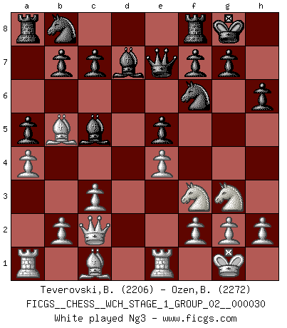 Last move : 1/2-1/2 2025 September 20 12:23:34 [Event "FICGS__CHESS__WCH_STAGE_1_GROUP_02__000030"] [Site "FICGS"] [Date "2025.08.03"] [Round "2"] [White "Teverovski,Bogoljub"] [Black "Ozen,Bahadir"] [Result "1/2-1/2"] [WhiteElo "2206"] [BlackElo "2272"] 1.e4 e5 2.Nf3 Nc6 3.Bb5 Nf6 4.d3 Bc5 5.c3 O-O 6.O-O d5 7.Nbd2 dxe4 8.dxe4 Qe7 9.Qc2 a5 10.a4 Nb8 11.Re1 h6 12.Nf1 Bd7 13.Ng3 Rd8 14.h3 Bxb5 15.axb5 Qe8 16.Nf5 Bf8 17.Bd2 Qxb5 18.c4 Qe8 19.Rxa5 Nbd7 20.Rxa8 Rxa8 21.Bc3 Ra2 22.Qb1 Ra8 23.Ne3 c6 24.b4 b6 25.Rd1 Qe6 26.Ne1 Ne8 27.Qc2 1/2-1/2 Follow this game move after move (download)Mistrust is the most necessary characteristic of the Chess player. (Siegbert Tarrasch) Modernes Schach sorgt sich zuviel um Dinge wie Bauernstruktur usw. Vergessen Sie das, Schachmatt beendet das Spiel! (Nigel Short) Los errores estan ahí, esperando a que se cometan. (Savielly Tartakower) Le jeu d'échecs est comme rejeté hors du temps. (Antoine de Saint-Exupéry) Wawaweewa ! (Borat: Cultural learnings of America for make benefit glorious nation of Kazakhstan)