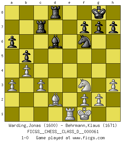 Last move : 1-0 2008 January 27 12:5:49 [Event "FICGS__CHESS__CLASS_D__000061"] [Site "FICGS"] [Date "2007.10.05"] [Round "1"] [White "Warding,Jonas"] [Black "Behrmann,Klaus"] [Result "1-0"] [WhiteElo "1600"] [BlackElo "1671"] 1.e4 c6 2.Nf3 d5 3.exd5 cxd5 4.d4 Nf6 5.Nc3 e6 6.Bb5+ Bd7 7.O-O Bxb5 8.Nxb5 a6 9.Nc3 Bd6 10.h3 O-O 11.Re1 Qc7 12.a3 Nbd7 13.Kf1 Rac8 14.Qd3 b5 15.Bd2 Rfd8 16.b4 e5 17.dxe5 Nxe5 18.Nxd5 Nxd3 19.Nxc7 Nxe1 20.Rxe1 Rxc7 21.c3 1-0 Caro-Kann defense Kingside Castling by player White (move 7) Kingside Castling by player Black (move 10) Player White won this chess game. Follow this game move after move (download)You must take your opponent into a deep dark forest where 2+2=5, and the path leading out is only wide enough for one. (Mikhail Tal) Auf Remis zu spielen ist gewissermaßen ein Verbrechen gegen das Schachspiel. (Mikhail Nekhemyevich Tal) Solo puedes ser bueno en el Ajedrez si amas al juego. (Bobby Fischer) Il n'y a pas de prix trop élevé au scalp de l'ennemi. (Koblentz) All art requires courage. (Anne Tucker)