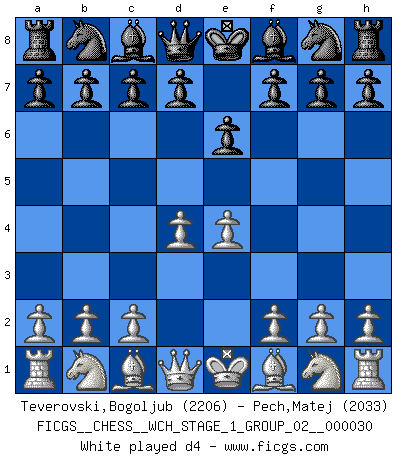 Last move : 1/2-1/2 2025 December 14 1:55:13 [Event "FICGS__CHESS__WCH_STAGE_1_GROUP_02__000030"] [Site "FICGS"] [Date "2025.08.03"] [Round "2"] [White "Teverovski,Bogoljub"] [Black "Pech,Matej"] [Result "1/2-1/2"] [WhiteElo "2206"] [BlackElo "2033"] 1.e4 e6 2.d4 d5 3.Nd2 c5 4.exd5 Qxd5 5.Ngf3 cxd4 6.Bc4 Qd6 7.O-O Nf6 8.Nb3 Nc6 9.Nbxd4 Nxd4 10.Nxd4 a6 11.Re1 Qc7 12.Bb3 Bd6 13.Nf5 Bxh2+ 14.Kh1 O-O 15.Nxg7 Rd8 16.Qf3 Kxg7 17.Bh6+ Kg6 18.c3 Nh5 19.Bc1 Bf4 20.g4 Bxc1 21.gxh5+ Kg7 22.Raxc1 b6 23.Bc2 Bb7 24.Be4 Rd5 25.Qg4+ Kh8 26.Bxd5 Bxd5+ 27.f3 Rg8 28.Qd4+ Rg7 29.Qf6 Qg3 30.Qd8+ Rg8 31.Qf6+ Rg7 32.Qd8+ Rg8 33.Qf6+ Rg7 1/2-1/2 Follow this game move after move (download)If a ruler does not understand Chess, how can he rule over a kingdom ? (King Khusros II) Die Idee von Capablanca, Schach als Fach in den Schulen zu lehren, ist großartig. (Fidel Castro) El Ajedrez es el juego mas altamente simbólico, pero las agresiones estan por lo tanto aún mas francamente representadas en la partida. Tal vez comenzo como un juego de guerra; Algo como la representación de una batalla en miniatura entre las fuerzas de dos reinos. (Karl Meninger) Le temps de noter son nom sur la feuille de partie, j'étais déjà en zeitnot ! D'un modeste amateur apparié lors de la première ronde d'un open contre le grand-maître Azmaïparashvili. There are 10 types of people in this world: those who understand binary and those who don't. (Anonymous)