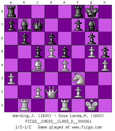 Last move : 1/2-1/2 2007 November 9 1:4:36 [Event "FICGS__CHESS__CLASS_D__000061"] [Site "FICGS"] [Date "2007.10.05"] [Round "1"] [White "Warding,Jonas"] [Black "Sosa Landa,Hugo Rafael"] [Result "1/2-1/2"] [WhiteElo "1600"] [BlackElo "1600"] 1.e4 g6 2.Nf3 Bg7 3.Bc4 d6 4.O-O e6 5.d3 Ne7 6.Bg5 Bxb2 7.Nbd2 h6 8.Rb1 Bg7 9.Bxe7 Qxe7 10.h3 O-O 11.Re1 Nc6 12.a3 Ne5 13.Nxe5 Bxe5 14.Nf3 Bg7 15.g4 b6 16.Qd2 Bb7 17.g5 h5 18.h4 c5 19.d4 Qc7 20.d5 e5 1/2-1/2 Robatsch (Modern) defense Kingside Castling by player White (move 4) Kingside Castling by player Black (move 10) This chess game ended in a draw. Follow this game move after move (download)Discovered check is the dive bomber of the Chessboard. (Reuben Fine) Man kann eine Schachpartie nur gewinnen, wenn das Gleichgewicht gestört ist. In einer Stellung mit ungestörtem Gleichgewicht ist auch das größte Genie hilflos - in der Stellung steckt dann eben kein genialer Einfall. (Wilhelm Steinitz) Nunca antes ha habido un jugador de Ajedrez con tal conocimiento a fondo de las complejidades del juego y una inmensa voluntad absolutamente indomable de ganar. Yo pienso que Fischer es el jugador mas grande que jamás haya existido. (Lisa Lane) Même un GMI sait rarement calculer sur plus de cinq coups une attaque à sacrifices. (Rudolf Spielmann) Logic : The art of thinking and reasoning in strict accordance with the limitations and incapacities of the human misunderstanding. (Ambrose Bierce)