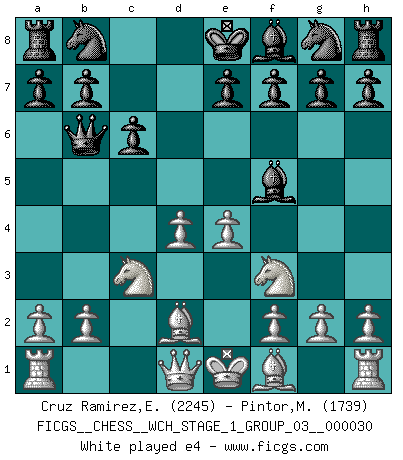 Last move : 1-0 2025 September 3 6:35:21 [Event "FICGS__CHESS__WCH_STAGE_1_GROUP_03__000030"] [Site "FICGS"] [Date "2025.08.03"] [Round "1"] [White "Cruz Ramirez,Eliecer"] [Black "Pintor,Manuel"] [Result "1-0"] [WhiteElo "2245"] [BlackElo "1739"] 1.d4 d5 2.c4 c6 3.Nf3 Bf5 4.cxd5 Qxd5 5.Nc3 Qa5 6.Bd2 Qb6 7.e4 Bg4 8.Qc2 Bxf3 9.gxf3 Qxd4 10.Nd5 Na6 11.Bxa6 cxd5 12.Bb5+ Kd8 13.Ba5+ b6 14.Qc6 Nf6 15.Rc1 e5 16.Qc7+ 1-0 Follow this game move after move (download)Every Pawn is a potential Queen. (James Mason) Ein Schachspiel besteht aus drei Phasen: Die erste, wenn du hofftst den Vorteil zu haben, die zweite, wenn du glaubst einen Vorteil zu haben, und die dritte.... wenn du weißt Du wirst verlieren. (Savielly Grigorievitsch Tartakower) El Ajedrez es tortura mental. (Garry Kasparov) Vouloir jouer aux échecs contre soi-même est aussi paradoxal que vouloir marcher sur son ombre. (Stefan Zweig) I live to kill Traxler counterattack. (Ilmars Cirulis)