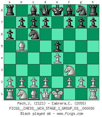 Last move : 0-1 2025 October 11 0:54:33 [Event "FICGS__CHESS__WCH_STAGE_1_GROUP_03__000030"] [Site "FICGS"] [Date "2025.08.03"] [Round "1"] [White "Pech,Jaroslav senior"] [Black "Cabrera,Claudio"] [Result "0-1"] [WhiteElo "2121"] [BlackElo "2055"] 1.e4 e5 2.Nf3 Nc6 3.Bb5 a6 4.Ba4 Nf6 5.O-O Nxe4 6.d4 b5 7.Bb3 d5 8.dxe5 Be6 9.Nbd2 Nc5 10.c3 d4 11.Bxe6 Nxe6 12.cxd4 Ncxd4 13.a4 Bc5 14.Ne4 O-O 15.Nxc5 Nxf3+ 16.Qxf3 Nxc5 17.axb5 axb5 18.Bg5 Rxa1 19.Bxd8 Rxf1+ 20.Kxf1 Rxd8 21.h4 Ne6 22.h5 c5 23.g3 h6 24.Qc6 Rd1+ 25.Kg2 Rd4 26.Qxb5 Rb4 27.Qe2 c4 28.Qc2 Rb3 29.Kf1 Kh8 30.Ke1 Rb5 0-1 This chess game has been lost on time (started : 2025.08.03 1:24:26) Follow this game move after move (download)The passed Pawn is a criminal, who should be kept under lock and key. Mild measures, such as police surveillance, are not sufficient. (Aaron Nimzovich) Stelle das Brett so, daß die Sonne in die Augen deines Gegners scheint. (Ruy López) La batalla por la última verdad nunca sera ganada. Y es por eso que el Ajedrez es tan fascinante. (Hans Kmoch) Je crois qu'il existe des manières très spécifiques de jouer efficacement contre une machine. Evidemment, nous n'avons aucune chance en technique pure, parce que l'ordinateur calcule de manière parfaite. Mais lorsque nous faisons appel à notre cerveau, en utilisant l'intuition et la compréhension, alors nous restons beaucoup plus forts. (Anatoli Karpov) Inventor: A person who makes an ingenious arrangement of wheels, levers and springs, and believes it civilization. (Ambrose Bierce, The Devil's Dictionary)