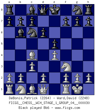 Last move : 1/2-1/2 2025 November 2 2:40:55 [Event "FICGS__CHESS__WCH_STAGE_1_GROUP_04__000030"] [Site "FICGS"] [Date "2025.08.03"] [Round "1"] [White "DeBonis,Patrick"] [Black "Ward,David"] [Result "1/2-1/2"] [WhiteElo "2264"] [BlackElo "2248"] 1.e4 e5 2.Nf3 Nc6 3.Bc4 Bc5 4.O-O d6 5.c3 Bb6 6.b4 Nf6 7.a4 a5 8.b5 Ne7 9.Re1 Bg4 10.h3 Bh5 11.Bf1 Ng6 12.d3 Nh4 13.Be2 Nd7 14.Nbd2 Qf6 15.d4 Nxf3+ 16.Bxf3 Bxf3 17.Nxf3 h6 18.Be3 O-O-O 19.Rc1 Rhe8 20.Nd2 exd4 21.cxd4 Bxd4 22.Nb3 Bxe3 23.Rxe3 Nc5 24.Nxa5 Rxe4 25.Rxe4 Nxe4 26.Qd5 Qxf2+ 27.Kh1 Ng3+ 28.Kh2 1/2-1/2 Follow this game move after move (download)Let the perfectionist play postal. (Yasser Seirawan) Um sich vor der Gefahr einer Erkältung zu schützen, sorge der wanderlustige König beizeiten für ein brauchbares Versteck. (Aaron Nimzowitsch) El Ajedrez es sobre todo, ¡una pelea!. (Emanuel Lasker) Aidez vos pièces, elles vous aideront. (Paul Morphy) There are two kinds of tragedy in this world, one is not getting what you want and the other is getting. (Lord of war)