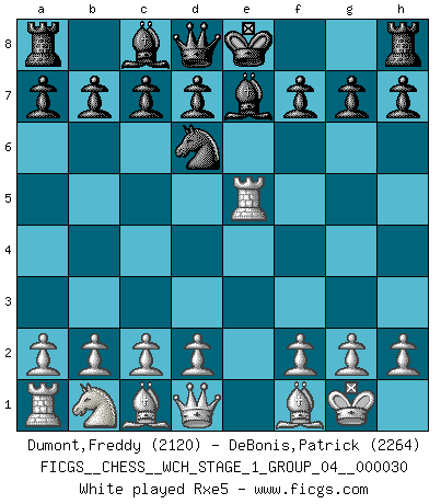 Last move : 1/2-1/2 2025 September 2 15:37:2 [Event "FICGS__CHESS__WCH_STAGE_1_GROUP_04__000030"] [Site "FICGS"] [Date "2025.08.03"] [Round "1"] [White "Dumont,Freddy"] [Black "DeBonis,Patrick"] [Result "1/2-1/2"] [WhiteElo "2120"] [BlackElo "2264"] 1.e4 e5 2.Nf3 Nc6 3.Bb5 Nf6 4.O-O Nxe4 5.Re1 Nd6 6.Nxe5 Be7 7.Bf1 Nxe5 8.Rxe5 O-O 9.d4 Bf6 10.Re1 Re8 11.Bf4 Rxe1 12.Qxe1 Ne8 13.Bd3 g6 14.c3 Ng7 15.Nd2 d5 16.Nf3 Bg4 17.Ne5 Bf5 18.Bxf5 Nxf5 19.h3 c6 20.a4 Bg5 21.Bh2 a6 22.a5 Nd6 1/2-1/2 Follow this game move after move (download)One doesn't have to play well, it's enough to play better than your opponent. (Siegbert Tarrasch) Sie bekommen vielleicht den Eindruck, dass die Spitzenspieler überhaupt gar nicht so stark sind. Aber das stimmt nicht. Es ist eine Illusion. Mit einem Computer an der Seite ist es sehr leicht, Urteile zu fällen, aber wenn man alleine am Brett sitzt, sieht die Sache ganz anders aus. (Vladimir Kramnik) Solo existe una cosa que Fischer hace en el Ajedrez sin placer: ¡perder!. (Boris Spassky) La conception d'un plan est le processus par lequel un joueur exploite les avantages de sa position tout en s'efforçant d'en réduire au minimum les inconvénients. Afin de garantir le succès, un plan doit toujours se fonder sur un diagnostic objectif des particularités d'une position. La conception d'un plan est d'autant plus difficile que la position est équilibrée, et grandement facilitée lorsqu'il n'existe qu'un seul plan susceptible de répondre aux exigences de la position. (Harry Golombek) Man is still the most extraordinary computer of all. (John F. Kennedy)
