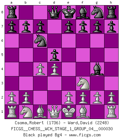 Last move : 0-1 2025 November 8 12:24:17 [Event "FICGS__CHESS__WCH_STAGE_1_GROUP_04__000030"] [Site "FICGS"] [Date "2025.08.03"] [Round "2"] [White "Csoma,Robert"] [Black "Ward,David"] [Result "0-1"] [WhiteElo "1736"] [BlackElo "2248"] 1.Nf3 d5 2.d4 Nc6 3.c4 Bg4 4.e3 e6 5.h3 Bh5 6.Nbd2 Nf6 7.cxd5 exd5 8.Be2 Bd6 9.O-O O-O 10.a3 a5 11.Qb3 Qd7 12.Nb1 a4 13.Qd1 Na5 14.Nbd2 Qe8 15.b4 axb3 16.Nxb3 Nc4 17.Bxc4 dxc4 18.Nbd2 c3 19.Nc4 Qe4 20.Nxd6 cxd6 21.g4 c2 22.Qe2 Bxg4 0-1 This chess game has been lost on time (started : 2025.08.03 1:24:29) Follow this game move after move (download)Pawns are born free, yet they are everywhere in chains. (Rick Kennedy) Kann Schach nicht schließlich das Nationalspiel der Deutschen werden? Und welche weiteren Ausblicke bieten sich dann dar! Welche Hebung des allgemeinen Kultur-Niveaus, ja der Moral, wenn das Schachbrett den Kartentisch verdrängen würde! Wahrlich, ein Ziel, des Schweißes der Edlen wert! (Siegbert Tarrasch) Los Peones son nacidos libres, y aún así, se encuentran encadenados por todos lados. (Rick Kennedy) A chaque perte on perd un peu de soi. (Joël Lautier) The bottom line is always the bottom line. (Johann Piek)