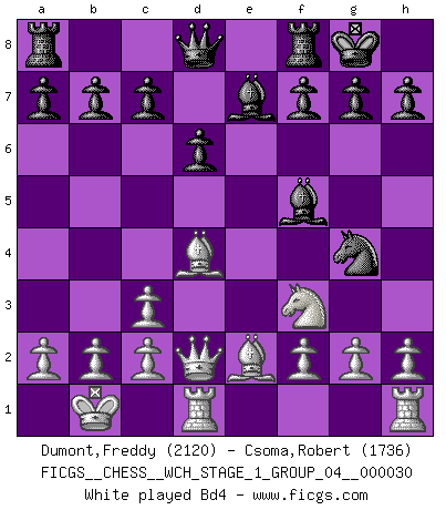Last move : 1-0 2025 September 9 11:0:59 [Event "FICGS__CHESS__WCH_STAGE_1_GROUP_04__000030"] [Site "FICGS"] [Date "2025.08.03"] [Round "2"] [White "Dumont,Freddy"] [Black "Csoma,Robert"] [Result "1-0"] [WhiteElo "2120"] [BlackElo "1736"] 1.e4 Nf6 2.e5 Nd5 3.Nc3 Nxc3 4.dxc3 Nc6 5.Nf3 d6 6.exd6 exd6 7.Be3 Be7 8.Qd2 O-O 9.O-O-O Bf5 10.Kb1 Ne5 11.Be2 Ng4 12.Bd4 c5 13.Qf4 cxd4 14.Nxd4 Nxf2 15.Qxf2 Bg6 16.Nf5 Bxf5 17.Qxf5 g6 18.Qf4 Qc7 19.h4 Rad8 20.Rd5 a6 21.h5 Qc6 22.Qh6 g5 23.Rxg5+ Bxg5 24.Qxg5+ Kh8 25.h6 1-0 Follow this game move after move (download)Chess is like war on a board. (Bobby Fischer) Ich hatte Angst gegen einen russischen Großmeister zu verlieren, und er befürchtete gegen einen kleinen Jungen zu verlieren. (über ein Remis gegen Juri Awerbach). (Robert James Fischer) El Ajedrez es realmente noventa y nueve por ciento calculación. (Soltis) Horreur, mais aussi harmonie suprême : qu'y avait-il en effet au monde en dehors des échecs ? Le brouillard, l'inconnu, le non-être... (Vladimir Nabokov) Once you start thinking you have nothing left to learn, you have everything to learn. (Steve Badget)