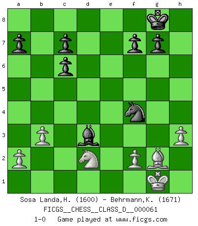 Last move : 1-0 2008 February 1 0:20:47 [Event "FICGS__CHESS__CLASS_D__000061"] [Site "FICGS"] [Date "2007.10.05"] [Round "1"] [White "Sosa Landa,Hugo Rafael"] [Black "Behrmann,Klaus"] [Result "1-0"] [WhiteElo "1600"] [BlackElo "1671"] 1.g3 d5 2.Bg2 Nf6 3.Nf3 e6 4.c4 Nc6 5.cxd5 exd5 6.O-O d4 7.d3 Be7 8.b3 O-O 9.Bb2 Re8 10.Na3 Bxa3 11.Bxa3 Nd5 12.Bb2 Bg4 13.Re1 Qf6 14.Qd2 Rad8 15.h3 Bh5 16.Nh2 Re6 17.e4 dxe3 18.Bxf6 exd2 19.Rxe6 Nxf6 20.Rxc6 bxc6 21.g4 Rxd3 22.Rd1 Bg6 23.Nf1 h5 24.gxh5 Nxh5 25.Rxd2 Nf4 26.Rxd3 Bxd3 27.Nd2 1-0 Benko's Opening Kingside Castling by player White (move 6) Kingside Castling by player Black (move 8) Player White won this chess game. Follow this game move after move (download)I have never in my life played the French Defence, which is the dullest of all openings. (Wilhelm Steinitz) Kann Schach nicht schließlich das Nationalspiel der Deutschen werden? Und welche weiteren Ausblicke bieten sich dann dar! Welche Hebung des allgemeinen Kultur-Niveaus, ja der Moral, wenn das Schachbrett den Kartentisch verdrängen würde! Wahrlich, ein Ziel, des Schweißes der Edlen wert! (Siegbert Tarrasch) Alekhine es un poeta que crea un trabajo de arte de algo que raramente inspiraría a otra persona a mandar una tarjeta postal. (Max Euwe) A chaque perte on perd un peu de soi. (Joël Lautier) Computers make it easier to do a lot of things, but most of the things they make it easier to do don't need to be done. (Andy Rooney)