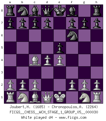 Last move : 0-1 2025 October 6 9:0:31 [Event "FICGS__CHESS__WCH_STAGE_1_GROUP_05__000030"] [Site "FICGS"] [Date "2025.08.03"] [Round "1"] [White "Joubert,Hennie"] [Black "Chronopoulos,Antonis"] [Result "0-1"] [WhiteElo "1685"] [BlackElo "2264"] 1.e4 e5 2.Bc4 Nf6 3.d4 exd4 4.Nf3 Bb4+ 5.c3 dxc3 6.bxc3 Bc5 7.O-O d5 8.exd5 O-O 9.Bb3 Bg4 10.h3 Bh5 11.c4 Ne4 12.Bf4 Qf6 13.Bxc7 Na6 14.Be5 Bxf3 15.Bxf6 Bxd1 0-1 Follow this game move after move (download)Spassky will not be psyched out by Fischer. (Mike Goodall) Als ich elf wurde, wurde ich einfach gut. (Robert James Fischer) ¿Esta Bobby Fischer algo cuerdo?. (Salo Flohr) Karpov est une pièce de musée. (Garry Kasparov) Games, world of games... There's always an opponent, and there's always a victim. (Revolver, movie)