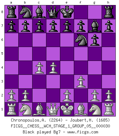 Last move : 1-0 2025 October 27 11:49:22 [Event "FICGS__CHESS__WCH_STAGE_1_GROUP_05__000030"] [Site "FICGS"] [Date "2025.08.03"] [Round "2"] [White "Chronopoulos,Antonis"] [Black "Joubert,Hennie"] [Result "1-0"] [WhiteElo "2264"] [BlackElo "1685"] 1.d4 Nf6 2.c4 g6 3.f3 Bg7 4.e4 d6 5.Nc3 e5 6.d5 O-O 7.Bg5 h6 8.Be3 a5 9.Qd2 Na6 10.O-O-O Kh7 11.h4 Nh5 12.Nge2 b6 13.g4 Nf6 14.Ng3 Nc5 15.g5 Nfd7 16.h5 gxh5 17.Bh3 hxg5 18.Bf5+ Kg8 19.Bxg5 f6 20.Bh6 Qe8 21.Nxh5 1-0 Follow this game move after move (download)Botvinnik tried to take the mystery out of Chess, always relating it to situations in ordinary life. He used to call Chess a typical inexact problem similar to those which people are always having to solve in everyday life. (Garry Kasparov) Über Karpov: Er war und ist ein Vertreter der russischen Reaktionäre. Das steckt tief in seiner Seele, wehalb ich nicht nett mit ihm umgehen kann. (Viktor Kortschnoi) ¿Porque tengo que perder ante este idiota?. (Aron Nimzovich) Le pion, dans sa simplicité, marche droit devant lui, mais lorsqu'il prend, il le fait obliquement? Ainsi l'homme, tant qu'il reste pauvre, marche dans la droiture et vit honnêtement, mais lorsqu'il recherche les honneurs, il flatte, se parjure et, par les voies obliques, cherche une position supérieure sur l'échiquier du monde. (Jean de Galles) To send light into the darkness of men's hearts - such is the duty of the artist. (Schumann)