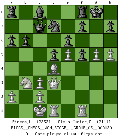 Last move : 1-0 2025 August 10 6:34:20 [Event "FICGS__CHESS__WCH_STAGE_1_GROUP_05__000030"] [Site "FICGS"] [Date "2025.08.03"] [Round "1"] [White "Pineda,Ulises"] [Black "Cleto Junior,Dirceu"] [Result "1-0"] [WhiteElo "2252"] [BlackElo "2111"] 1.e4 c5 2.Nf3 e6 3.Nc3 a6 4.d4 cxd4 5.Nxd4 Qc7 6.Bd3 Nf6 7.Qe2 Bc5 8.Nb3 Bd6 9.Rf1 O-O 10.f4 Be7 11.g4 d5 12.e5 Nfd7 13.Be3 b6 14.g5 g6 15.h4 Bb4 16.h5 Nc5 17.O-O-O Bxc3 18.bxc3 Nxd3+ 19.Qxd3 Nd7 20.f5 gxf5 21.Bd4 1-0 Follow this game move after move (download)Even the laziest King flees wildly in the face of a double check ! (Aaron Nimzowitsch) Man gibt nur Pakete auf. (Paul Keres) El Ajedrez era la lengua materna de Capablanca. (Reti) Ce qui caractérise les parties de combat, c'est que si le défenseur a constamment de difficiles problèmes à résoudre, l'attaquant doit chercher sans relâche de nouvelles possibilités d'attaque. (Koblentz) Gambling is the son of avarice and the father of despair. (French proverb)