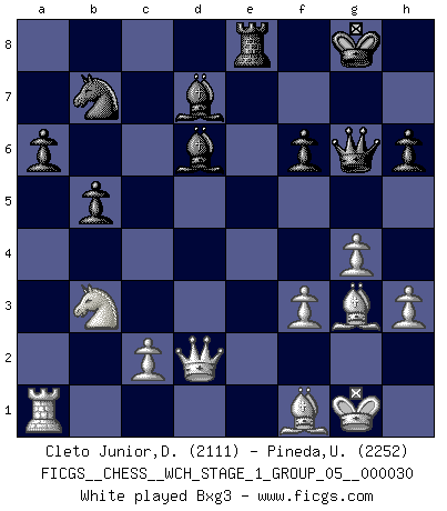 Last move : 1/2-1/2 2025 September 11 12:44:54 [Event "FICGS__CHESS__WCH_STAGE_1_GROUP_05__000030"] [Site "FICGS"] [Date "2025.08.03"] [Round "2"] [White "Cleto Junior,Dirceu"] [Black "Pineda,Ulises"] [Result "1/2-1/2"] [WhiteElo "2111"] [BlackElo "2252"] 1.e4 d6 2.d4 Nf6 3.Nc3 e5 4.Nf3 Nbd7 5.Bc4 Be7 6.O-O O-O 7.Re1 exd4 8.Nxd4 Re8 9.h3 Bf8 10.Bg5 c6 11.a4 Qa5 12.Qd2 h6 13.Bh4 Qh5 14.Bg3 Nc5 15.f3 Qg6 16.Kh2 Bd7 17.b4 Na6 18.b5 Nc5 19.a5 Rab8 20.Bf1 Nh5 21.Bh4 d5 22.e5 f6 23.exf6 Nxf6 24.Rxe8 Rxe8 25.a6 cxb5 26.axb7 a6 27.Nb3 Nxb7 28.Nxd5 Nh5 29.g4 Bd6+ 30.Kg1 Ng3 31.Nf6+ gxf6 32.Bxg3 Bxg3 33.Qxd7 Nd6 34.Nd4 Be5 35.c3 Qf7 36.Qxf7+ Kxf7 37.Ne2 Rc8 38.Rxa6 Ke6 39.Kf2 f5 40.f4 Bxc3 41.Nxc3 Rxc3 42.gxf5+ Kd7 43.f6 b4 44.Be2 b3 45.Rb6 b2 46.Bg4+ Kc7 1/2-1/2 Follow this game move after move (download)Chess problems demand from the composer the same virtues that characterize all worthwhile art: originality, invention, conciseness, harmony, complexity, and splendid insincerity. (Vladimir Nabokov) Es gibt Leute, die glauben, alles wäre vernünftig, was man mit einem ernsthaften Gesicht tut. (Georg Christoph Lichtenberg) ¿Quién es tu oponente esta tarde? Esta tarde mi oponente son las piezas negras. (Akiba Rubinstein) Même un GMI sait rarement calculer sur plus de cinq coups une attaque à sacrifices. (Rudolf Spielmann) Logic : The art of thinking and reasoning in strict accordance with the limitations and incapacities of the human misunderstanding. (Ambrose Bierce)