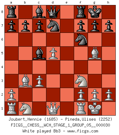 Last move : 0-1 2025 September 26 11:29:12 [Event "FICGS__CHESS__WCH_STAGE_1_GROUP_05__000030"] [Site "FICGS"] [Date "2025.08.03"] [Round "2"] [White "Joubert,Hennie"] [Black "Pineda,Ulises"] [Result "0-1"] [WhiteElo "1685"] [BlackElo "2252"] 1.e4 e5 2.Bc4 Nf6 3.d4 exd4 4.Nf3 Bb4+ 5.c3 dxc3 6.bxc3 Bc5 7.O-O d5 8.exd5 O-O 9.Bg5 Nbd7 10.Bb3 Re8 11.c4 h6 12.Bh4 g5 13.Bg3 Nh5 14.Nc3 f5 15.Nxg5 Qxg5 16.Bxc7 Ndf6 17.Na4 Re7 0-1 Follow this game move after move (download)Chess is everything: art, science and sport. (Anatoly Karpov) Ich spiele ehrlich und spiele, um zu gewinnen. Wenn ich verliere nehme ich meine Medizin. (Robert James Fischer) Un Peón pasado es un criminal, quién debe ser mantenido bajo candado y llave. Leves medidas, tales como vigilancia policiaca, no son suficientes. (Aaron Nimzovich) A chaque perte on perd un peu de soi. (Joël Lautier) If you have any trouble condescending, find a Unix user to show you how it's done. (Scott Adams)