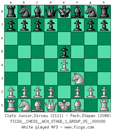 Last move : 1/2-1/2 2025 October 22 0:41:33 [Event "FICGS__CHESS__WCH_STAGE_1_GROUP_05__000030"] [Site "FICGS"] [Date "2025.08.03"] [Round "1"] [White "Cleto Junior,Dirceu"] [Black "Pech,Stepan"] [Result "1/2-1/2"] [WhiteElo "2111"] [BlackElo "2088"] 1.e4 e5 2.Nf3 Nc6 3.Bc4 Nf6 4.Ng5 d5 5.exd5 Na5 6.Bb5+ c6 7.dxc6 bxc6 8.Bd3 Nd5 9.Nf3 Bd6 10.O-O O-O 11.Re1 Re8 12.Nc3 f5 13.Bf1 e4 14.Nxd5 cxd5 15.Nd4 Qf6 16.c3 Nc4 17.d3 Ne5 18.Nb5 Bb8 19.dxe4 dxe4 20.Qh5 Bd7 21.Bg5 Qf8 22.Rad1 a6 23.Nd4 h6 24.Bf4 Kh7 25.f3 a5 26.Kh1 Qf6 27.g3 Ba7 28.Bb5 Bxb5 29.Nxb5 exf3 30.Rxe5 f2 31.Nxa7 Rxe5 32.Bxe5 Qxe5 33.Kg2 Rxa7 34.Qf3 1/2-1/2 Follow this game move after move (download)Chess is as much a mystery as women. (Purdy) Wenn ich einen Club besuche, sind die Spieler stumm vor Staunen. (José Raúl Capablanca) Cuando tu no sabes absolutamente que mas hacer, es tiempo de entrar en pánico. (John van der Wiel) Je crois qu'il existe des manières très spécifiques de jouer efficacement contre une machine. Evidemment, nous n'avons aucune chance en technique pure, parce que l'ordinateur calcule de manière parfaite. Mais lorsque nous faisons appel à notre cerveau, en utilisant l'intuition et la compréhension, alors nous restons beaucoup plus forts. (Anatoli Karpov) To steal ideas from one person is plagiarism. To steal from many is research. (Unknown)
