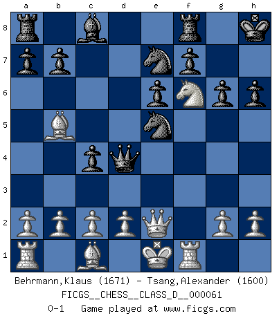Last move : 0-1 2008 February 15 13:31:23 [Event "FICGS__CHESS__CLASS_D__000061"] [Site "FICGS"] [Date "2007.10.05"] [Round "1"] [White "Behrmann,Klaus"] [Black "Tsang,Alexander"] [Result "0-1"] [WhiteElo "1671"] [BlackElo "1600"] 1.e4 c5 2.f4 g6 3.Nc3 Bg7 4.Nf3 Nc6 5.Bc4 e6 6.e5 d6 7.Bb5 Nge7 8.Ne4 dxe5 9.fxe5 O-O 10.Nf6+ Kh8 11.Ng5 h6 12.Ngh7 Bxf6 13.Nxf6 Qd4 14.Qe2 Nxe5 15.Rf1 c4 0-1 Sicilian : Grand Prix attack Kingside Castling by player Black (move 9) Player Black won this chess game. Follow this game move after move (download)All I want to do, ever, is just play Chess. (Bobby Fischer) Es ist wirklich schade, dass so viele Schachspieler nicht auf ihr Äußeres achten! (Alexandra Kosteniuk) Cuando tengas duda... ¡juega al Ajedrez!. (Tevis) En blitz, le Cavalier l'emporte sur le Fou. (Vlastimil Hort) Do not put your faith in what statistics say until you have carefully considered what they do not say. (William W. Watt)