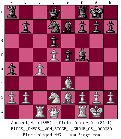 Last move : 0-1 2025 October 1 10:17:2 [Event "FICGS__CHESS__WCH_STAGE_1_GROUP_05__000030"] [Site "FICGS"] [Date "2025.08.03"] [Round "1"] [White "Joubert,Hennie"] [Black "Cleto Junior,Dirceu"] [Result "0-1"] [WhiteElo "1685"] [BlackElo "2111"] 1.e4 c5 2.Nf3 d6 3.d4 cxd4 4.Nxd4 Nf6 5.Nc3 a6 6.Be2 e5 7.Nb3 Be7 8.Be3 Be6 9.Nd5 Nxd5 10.exd5 Bf5 11.c4 O-O 12.Rc1 a5 13.O-O a4 14.Nd2 Nd7 15.Nf3 b6 16.Bd3 Bxd3 17.Qxd3 f5 18.Ne1 e4 19.Qd2 f4 20.Bxf4 Rxf4 21.Qxf4 Bg5 22.Qxe4 Bxc1 23.Nd3 Bg5 24.Nb4 Nc5 25.Qf5 Qf6 26.Qxf6 Bxf6 27.Rb1 Re8 28.f3 Re2 29.b3 Bd4+ 30.Kf1 Rf2+ 31.Ke1 Rxg2 32.Rd1 Bc3+ 0-1 Follow this game move after move (download)White lost because he failed to remember the right continuation and had to think up the moves himself. (Siegbert Tarrasch) Kein Schachspieler kann gut schlafen. (H. G. Wells) El Ajedrez es en su esencia, un juego. En su forma, un arte. Y en su ejecución, una ciencia. (Baron Tassilo) Les échecs sont un jeu terrible. Si vous n'avez pas le centre, votre adversaire a une position plus libre. Par contre, si vous avez le centre, alors vous avez vraiment quelque chose pour laquelle vous inquiéter ! (Siegbert Tarrasch) A married woman is like a fish riding a bicycle. (Rodolfo d'Ettorre)