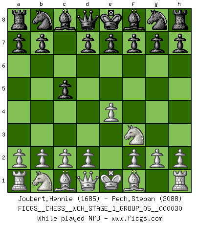 Last move : 1-0 2025 October 21 14:16:50 [Event "FICGS__CHESS__WCH_STAGE_1_GROUP_05__000030"] [Site "FICGS"] [Date "2025.08.03"] [Round "2"] [White "Joubert,Hennie"] [Black "Pech,Stepan"] [Result "1-0"] [WhiteElo "1685"] [BlackElo "2088"] 1.e4 c5 2.Nf3 Nc6 3.d4 cxd4 4.Nxd4 Nf6 5.Nc3 g6 6.Be3 Bg7 7.Be2 O-O 8.O-O d6 9.f3 d5 10.exd5 Nxd5 11.Bf2 Nxd4 12.Bxd4 Nxc3 13.Bxc3 Qb6+ 14.Kh1 1-0 This chess game has been lost on time (started : 2025.08.03 1:24:31) Follow this game move after move (download)If your opponent cannot do anything active, then don't rush the position; instead you should let him sit there, suffer, and beg you for a draw. (Jeremy Silman) Ich habe die besten Aussichten, den ersten Preis zu gewinnen - denn jeder muss gegen Steinitz spielen, nur ich nicht! (Wilhelm Steinitz) Todavía soy una víctima del Ajedrez. Tiene toda la belleza del arte y mucho mas. No puede ser comercializado. El Ajedrez es mas puro que el arte en su posición social. (Marcel Duchamp) Les échecs sont utiles à l'exercice de la faculté de penser et à celle de l'imagination. Car nous devons posséder une méthode élaborée pour atteindre des buts partout où nous devons conduire notre raison. (Leibnitz) No man has ever achieved immortality in his own life time. (Unknown)