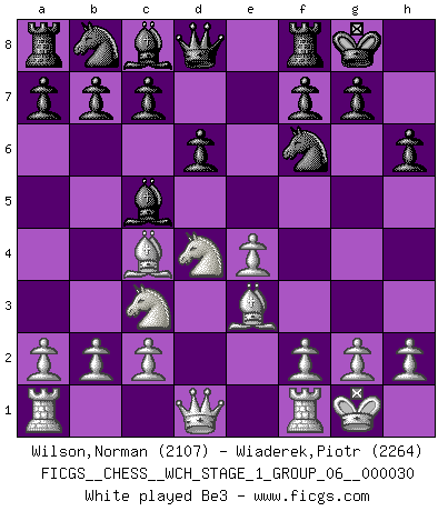 Last move : 1/2-1/2 2025 October 22 7:43:29 [Event "FICGS__CHESS__WCH_STAGE_1_GROUP_06__000030"] [Site "FICGS"] [Date "2025.08.03"] [Round "1"] [White "Wilson,Norman"] [Black "Wiaderek,Piotr"] [Result "1/2-1/2"] [WhiteElo "2107"] [BlackElo "2264"] 1.e4 e5 2.Nc3 Nf6 3.Bc4 Bc5 4.Nf3 d6 5.d4 exd4 6.Nxd4 O-O 7.O-O h6 8.Be3 Re8 9.f3 Nc6 10.Kh1 Nxd4 11.Bxd4 Bxd4 12.Qxd4 c6 13.Bd3 Be6 14.Qf2 b5 15.h3 Qc7 16.Rfe1 Re7 17.a3 a5 18.b4 Qa7 19.Qd2 Rae8 20.Rad1 axb4 21.axb4 Qb6 22.Ra1 Ra7 23.Rad1 Rae7 24.Rb1 Nh5 25.Kh2 Qd4 26.Ne2 Qb6 27.Nf4 Nf6 28.Kh1 Qb8 29.Ra1 Bc4 30.Ra6 Qb7 1/2-1/2 Follow this game move after move (download)Chess is a fairy tale of 1001 blunders. (Savielly Tartakower) Gewöhnliche Menschen denken nur daran, wie sie ihre Zeit verbringen. Ein intelligenter Mensch versucht, sie auszunutzen. (Arthur Schopenhauer) Hoy en día, si tu no eres un Gran Maestro a los 14 años, es mejor que lo olvides. (Anand Viswanathan) La conception d'un plan est le processus par lequel un joueur exploite les avantages de sa position tout en s'efforçant d'en réduire au minimum les inconvénients. Afin de garantir le succès, un plan doit toujours se fonder sur un diagnostic objectif des particularités d'une position. La conception d'un plan est d'autant plus difficile que la position est équilibrée, et grandement facilitée lorsqu'il n'existe qu'un seul plan susceptible de répondre aux exigences de la position. (Harry Golombek) The absolute truth is the thing that makes people laugh. (Carl Reiner)