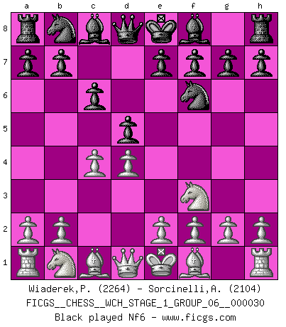 Last move : 1/2-1/2 2025 October 7 19:35:40 [Event "FICGS__CHESS__WCH_STAGE_1_GROUP_06__000030"] [Site "FICGS"] [Date "2025.08.03"] [Round "1"] [White "Wiaderek,Piotr"] [Black "Sorcinelli,Andrea"] [Result "1/2-1/2"] [WhiteElo "2264"] [BlackElo "2104"] 1.d4 d5 2.c4 c6 3.Nf3 Nf6 4.Nc3 dxc4 5.a4 e6 6.e3 c5 7.Bxc4 cxd4 8.exd4 Be7 9.Ne5 Nc6 10.Nxc6 bxc6 11.a5 O-O 12.O-O Rb8 13.a6 c5 14.dxc5 Bxc5 15.Qe2 Bd7 16.Bf4 Rc8 17.b3 Bc6 18.Rfd1 Qb6 19.Na4 Bxa4 20.Rxa4 Rfd8 21.R4a1 h6 22.Rac1 Bd4 23.g3 Nd5 24.Be5 Bxe5 25.Qxe5 Nb4 26.Qe2 g6 1/2-1/2 Follow this game move after move (download)It is not enough to be a good player... you must also play well. (Siegbert Tarrasch) Es macht mich traurig, wenn ich sehe, dass Golfprofis mehr verdienen als Schachsportler. Obwohl ich davon überzeugt bin, dass wir Schachspieler viel härter trainieren müssen als die Golfer. (Alexandra Kosteniuk) El Ajedrez es un regaderazo frío para la mente. (Sir John Simon) D'abord les bases : Jouez et étudiez, puis étudiez et jouez, ensuite jouez et étudiez, puis étudiez et jouez. Deuxièmement : Donnez toujours le meilleur de vous-même ! (Ken Smith) When you don't know what to do, walk fast and look worried. (Anonymous)