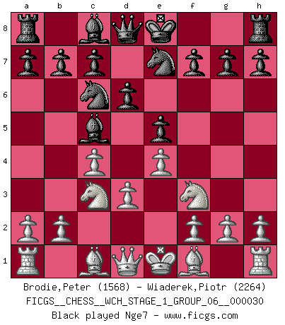 Last move : 0-1 2025 November 15 18:49:28 [Event "FICGS__CHESS__WCH_STAGE_1_GROUP_06__000030"] [Site "FICGS"] [Date "2025.08.03"] [Round "1"] [White "Brodie,Peter"] [Black "Wiaderek,Piotr"] [Result "0-1"] [WhiteElo "1568"] [BlackElo "2264"] 1.c4 e5 2.e4 Bc5 3.Nf3 Nc6 4.Nc3 d6 5.d3 Nge7 6.Be2 O-O 7.Be3 f5 8.O-O f4 9.Bxc5 dxc5 10.Qd2 Ng6 11.Nd5 Nd4 12.Nxd4 exd4 13.f3 c6 14.Nxf4 Nxf4 15.g3 Nxe2+ 16.Qxe2 b5 17.b3 bxc4 18.bxc4 Bh3 19.Rfe1 Qg5 20.f4 Rxf4 21.Kh1 R4f8 22.Kg1 h5 23.Kh1 Bg4 24.Qc2 h4 25.Qc1 Bf3+ 26.Kg1 Qg4 27.Kf2 hxg3+ 28.hxg3 Bxe4 29.Kg1 Qxg3+ 0-1 Follow this game move after move (download)The Chess pieces are the block alphabet which shapes thoughts; and these thoughts, although making a visual design on the chessboard, express their beauty abstractly, like a poem. (Marcel Duchamp) Privat ist Kortschnoi kein schlechter Mensch, sehr sympathisch. Aber während des Spiels ist er grausam. Er will dich töten. (Miguel Najdorf) Si tu oponente no puede hacer nada activo, entonces no apures la posición; En vez de eso, dejalo estar sentado ahí, sufriendo y rogandote por un empate. (Jeremy Silman) La tactique, c'est ce que vous faites quand il y a quelque chose à faire; la stratégie, c'est ce que vous faites quand il n'y a rien à faire. (Savielli Tartacower) I believe in luck. How else can you explain the success of those you dislike ? (Jean Cocteau)
