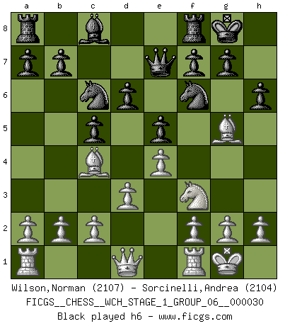 Last move : 1/2-1/2 2025 August 27 12:23:16 [Event "FICGS__CHESS__WCH_STAGE_1_GROUP_06__000030"] [Site "FICGS"] [Date "2025.08.03"] [Round "1"] [White "Wilson,Norman"] [Black "Sorcinelli,Andrea"] [Result "1/2-1/2"] [WhiteElo "2107"] [BlackElo "2104"] 1.e4 c5 2.Nc3 Nc6 3.Nf3 e5 4.Bc4 Be7 5.d3 d6 6.O-O Nf6 7.Nd5 O-O 8.Nxe7+ Qxe7 9.Bg5 h6 10.Bh4 Bg4 11.h3 Bxf3 12.Qxf3 Nd4 13.Qd1 g5 14.Bg3 b5 15.Bb3 a5 16.c3 Ne6 17.Re1 a4 18.Bxe6 Qxe6 19.d4 Rfe8 20.dxe5 dxe5 21.Qe2 c4 22.Rad1 Rad8 23.a3 Kg7 24.Qe3 Rxd1 25.Rxd1 Qc6 26.f3 Re7 27.Kh2 Rd7 28.Rxd7 Nxd7 1/2-1/2 Follow this game move after move (download)Chess is war over the board. The object is to crush the opponents mind. (Bobby Fischer) Stelle das Brett so, daß die Sonne in die Augen deines Gegners scheint. (Ruy López) Aquel que toma al Peón de Caballo de la Reina, se pasará la noche a dormir en la calle. (Anónimo) Il vaut mieux sacrifier les pièces de l'adversaire. (Xavier Tartacover) Think like a man of action, act like a man of thought. (Henri Louis Bergson)