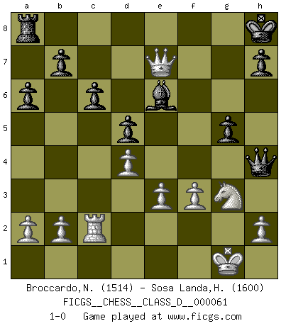 Last move : 1-0 2008 February 13 13:22:29 [Event "FICGS__CHESS__CLASS_D__000061"] [Site "FICGS"] [Date "2007.10.05"] [Round "1"] [White "Broccardo,Nicola"] [Black "Sosa Landa,Hugo Rafael"] [Result "1-0"] [WhiteElo "1514"] [BlackElo "1600"] 1.c4 f5 2.Nf3 e6 3.Nc3 Nf6 4.d4 d5 5.Bg5 c6 6.e3 Be7 7.cxd5 exd5 8.Bd3 O-O 9.O-O Ne4 10.Bxe7 Qxe7 11.Qb3 Kh8 12.Ne2 g5 13.Bxe4 fxe4 14.Ne5 Nd7 15.Nxd7 Qxd7 16.Rac1 Qg4 17.Rc2 Rf7 18.Qa3 Be6 19.Ng3 a6 20.f3 exf3 21.Rxf3 Rxf3 22.gxf3 Qh4 23.Qe7 1-0 English : Anglo-Dutch defense Kingside Castling by player Black (move 8) Kingside Castling by player White (move 9) Player White won this chess game. Follow this game move after move (download)In Chess, as it is played by masters, chance is practically eliminated. (Emanuel Lasker) In Buenos Aires ist es nicht mein vorrangiges Ziel ein starkes Turnier zu organisieren, sondern ein Turnier für Gentlemen. Ich würde nie Kamsky einladen. Ich mag keine Probleme. (Miguel Najdorf) La maestría del Ajedrez consiste esencialmente en analizar posiciónes de Ajedrez con precisión. (Mikhail Botvinnik) Comme les marins qui ont mille raisons différentes d'aller en mer, les joueurs d'échecs en ont tout autant avant de s'installer devant une table et jouer... (Vincent Bertignac, philosophe) A married woman is like a fish riding a bicycle. (Rodolfo d'Ettorre)