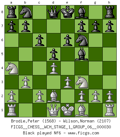 Last move : 0-1 2025 September 18 18:5:47 [Event "FICGS__CHESS__WCH_STAGE_1_GROUP_06__000030"] [Site "FICGS"] [Date "2025.08.03"] [Round "1"] [White "Brodie,Peter"] [Black "Wilson,Norman"] [Result "0-1"] [WhiteElo "1568"] [BlackElo "2107"] 1.Nf3 d5 2.d4 c6 3.Bf4 Qb6 4.b3 Bf5 5.Nc3 e6 6.Na4 Qa5+ 7.Bd2 Qd8 8.e3 Nf6 9.Nc5 Bxc5 10.dxc5 Nbd7 11.Be2 Nxc5 12.Bb4 Qb6 13.Bxc5 Qxc5 14.c4 dxc4 15.bxc4 Rd8 16.Nd2 Ne4 17.g4 Rxd2 18.Qb3 Rxe2+ 19.Kxe2 Bxg4+ 20.f3 Bxf3+ 0-1 Follow this game move after move (download)You can only get good at Chess if you love the game. (Bobby Fischer) Man braucht nicht immer den besten Zug zu spielen: Ein Zug muß aktiv, unternehmungslustig, korrekt und schön sein. (David Bronstein) Robert Fischer es la ley hacia si mismo. (Larry Evans) Les échecs sont un jeu terrible. Si vous n'avez pas le centre, votre adversaire a une position plus libre. Par contre, si vous avez le centre, alors vous avez vraiment quelque chose pour laquelle vous inquiéter ! (Siegbert Tarrasch) Without enthusiasm, virtue functions not at all, and vice only poorly. (Mignon McLaughlin, The Neurotic's Notebook, 1960)