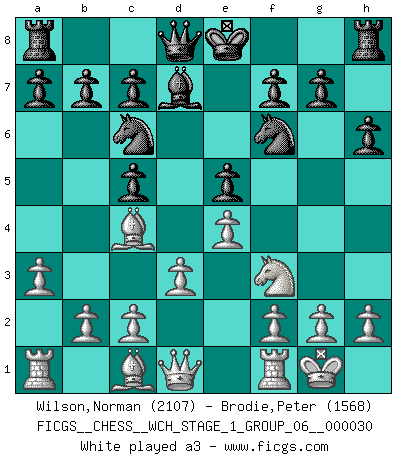 Last move : 1-0 2025 October 22 17:47:33 [Event "FICGS__CHESS__WCH_STAGE_1_GROUP_06__000030"] [Site "FICGS"] [Date "2025.08.03"] [Round "2"] [White "Wilson,Norman"] [Black "Brodie,Peter"] [Result "1-0"] [WhiteElo "2107"] [BlackElo "1568"] 1.e4 e5 2.Nc3 Nc6 3.Bc4 Bc5 4.Nf3 h6 5.d3 Nf6 6.O-O d6 7.Na4 Bd7 8.Nxc5 dxc5 9.a3 O-O 10.h3 Qe8 11.b4 b6 12.bxc5 bxc5 13.Be3 Nd4 14.Rc1 Be6 15.Nxe5 Bxc4 16.Nxc4 Ne6 17.f4 Nd4 18.c3 Ne6 19.f5 Nd8 20.Bxc5 Nc6 21.Bxf8 Qxf8 22.e5 Nd7 23.d4 f6 24.Qa4 Ndb8 25.Rce1 Nd7 26.Qxc6 Qd8 27.e6 Nb6 28.Nxb6 axb6 29.e7 Qe8 30.Qxa8 Qxa8 31.e8Q+ 1-0 Follow this game move after move (download)I had a toothache during the first game. In the second game I had a headache. In the third game it was an attack of rheumatism. In the fourth game, I wasn't feeling well. And in the fifth game? Well, must one have to win every game ? (Siegbert Tarrasch) Deine Wertungszahl - vorausgesetzt einige Jahre schachliche Anstrengung - entspricht etwa dem zehnfachen Deines IQ plus 1000. (Jonathan Levitt) Por tratar de evitar la pérdida de una pieza, muchas personas han perdido una partida de Ajedrez. (Savielly Tartakover) Horreur, mais aussi harmonie suprême : qu'y avait-il en effet au monde en dehors des échecs ? Le brouillard, l'inconnu, le non-être... (Vladimir Nabokov) War is the child of passion, passion is the child of narcissism and narcissism is the child. (...) Another game ? (Thibault de Vassal)