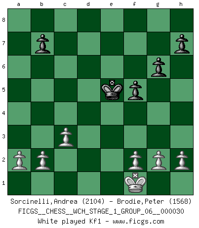 Last move : 1-0 2025 October 30 9:40:14 [Event "FICGS__CHESS__WCH_STAGE_1_GROUP_06__000030"] [Site "FICGS"] [Date "2025.08.03"] [Round "1"] [White "Sorcinelli,Andrea"] [Black "Brodie,Peter"] [Result "1-0"] [WhiteElo "2104"] [BlackElo "1568"] 1.e4 e5 2.Nf3 Nc6 3.Bb5 Nd4 4.Nxd4 exd4 5.O-O c6 6.Bc4 d5 7.exd5 cxd5 8.Bb5+ Bd7 9.Re1+ Be7 10.Qg4 g6 11.Qxd4 f6 12.Qxd5 Bxb5 13.Qxb5+ Qd7 14.Qxd7+ Kxd7 15.d3 Re8 16.Nc3 f5 17.Nd5 Bd6 18.Rxe8 Kxe8 19.Be3 Ne7 20.Nxe7 Kxe7 21.Bxa7 Rc8 22.c3 Bc5 23.Bxc5+ Rxc5 24.d4 Rd5 25.Re1+ Kf6 26.Re5 Rxe5 27.dxe5+ Kxe5 28.Kf1 b5 29.Ke2 g5 30.Ke3 f4+ 31.Kd3 h5 32.b3 Kd5 33.c4+ bxc4+ 34.bxc4+ Kc5 35.Kc3 g4 36.g3 fxg3 37.fxg3 Kc6 38.Kd4 Kc7 39.Kc5 Kb7 40.Kd6 Kc8 41.c5 1-0 Follow this game move after move (download)Fischer is under obligation to nobody. (Joseph Platz) Je älter ich werde, um so mehr schätze ich die Bauern. (Paul Keres) No es una movida, aún la mejor movida que tu debas buscar, sino un plan comprensible. (Eugene Znosko-Borovsky) Mon pion favori sur ma case favorite ! Bronstein en parlant d'un coup de pion en h5 quand il avait les Noirs. You can think I'm wrong, but that's no reason to quit thinking. (Gregory House, House M.D.)