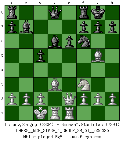 Last move : 1/2-1/2 2025 August 18 15:43:50 [Event "FICGS__CHESS__WCH_STAGE_1_GROUP_SM_01__000030"] [Site "FICGS"] [Date "2025.08.03"] [Round "1"] [White "Osipov,Sergey"] [Black "Gounant,Stanislas"] [Result "1/2-1/2"] [WhiteElo "2304"] [BlackElo "2291"] 1.e4 e6 2.d4 d5 3.Nc3 dxe4 4.Nxe4 Nd7 5.Nf3 Ngf6 6.Nxf6+ Nxf6 7.Be3 Bd6 8.Bd3 b6 9.Qe2 Bb7 10.O-O-O O-O 11.Rhe1 c5 12.dxc5 bxc5 13.Bg5 h6 14.Bh4 Bf4+ 15.Kb1 Qe7 16.Ne5 Rfd8 17.Ng4 Bg5 18.Bxg5 hxg5 19.Ne5 Rab8 20.g3 g4 21.Bc4 Rxd1+ 22.Rxd1 Bd5 23.b3 Qb7 24.Kb2 a5 25.Bxd5 exd5 26.Nxg4 Ne4 27.f3 1/2-1/2 Follow this game move after move (download)One doesn't have to play well, it's enough to play better than your opponent. (Siegbert Tarrasch) Bis zum Jahr 1971 verlief in meiner Schachkariere alles glatt. Dieses dramatische Match [Fischer-Taimanov 6:0] machte mein Leben zur Hölle. (Mark Taimanov) El ganar no lo es todo... pero el perder es nada. (Mednis) Votre seul travail dans les ouvertures est d'obtenir un milieu de partie jouable. (Lajos Portish) When it is a question of money, everybody is of the same religion. (Voltaire)