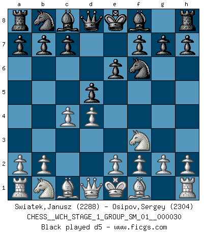 Last move : 1-0 2025 September 11 14:35:30 [Event "FICGS__CHESS__WCH_STAGE_1_GROUP_SM_01__000030"] [Site "FICGS"] [Date "2025.08.03"] [Round "1"] [White "Swiatek,Janusz"] [Black "Osipov,Sergey"] [Result "1-0"] [WhiteElo "2288"] [BlackElo "2304"] 1.d4 Nf6 2.c4 e6 3.Nf3 d5 4.Nc3 c6 5.Bg5 dxc4 6.e4 b5 7.e5 h6 8.Bh4 g5 9.Nxg5 hxg5 10.Bxg5 Nbd7 11.g3 Bb7 12.Bg2 Qb6 13.exf6 O-O-O 14.O-O 1-0 Follow this game move after move (download)Fischer is the strongest player in the world. In fact, the strongest player who ever lived. (Larry Evans) Schach ist wie eine schöne Frau, zu der wir ständig zurückkehren, gleichviel, wie oft sie uns zurückweist. (Anonymous) Un juego de Ajedrez es un dialogo, una conversación entre un jugador y su oponente. Cada movimiento del oponente puede contener amenazas o tropiezos, pero un jugador no se puede defender de las amenazas o tomar ventaja de los tropiezos si es que no se pregunta a sí mismo: ¿Que es lo que mi oponente va a hacer después de cada movida?. (Bruce A. Moon) 'L'échange des dames est un coup dur pour les deux adversaires...' Un journaliste lors d'une partie du match Spassky-Fischer A clear conscience is usually the sign of a bad memory. (Unknown)