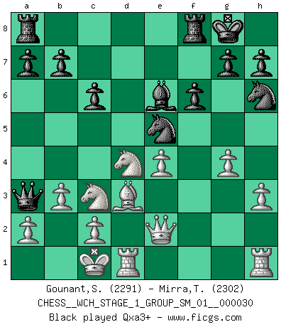 Last move : 1/2-1/2 2025 August 15 21:15:28 [Event "FICGS__CHESS__WCH_STAGE_1_GROUP_SM_01__000030"] [Site "FICGS"] [Date "2025.08.03"] [Round "1"] [White "Gounant,Stanislas"] [Black "Mirra,Theodore"] [Result "1/2-1/2"] [WhiteElo "2291"] [BlackElo "2302"] 1.b3 e5 2.Bb2 Nc6 3.e3 d5 4.Bb5 Bd6 5.f4 Qh4+ 6.g3 Qe7 7.Nf3 f6 8.Nc3 Be6 9.h3 Nh6 10.g4 exf4 11.Qe2 O-O 12.O-O-O fxe3 13.dxe3 Ne5 14.e4 d4 15.Nxd4 c6 16.Bd3 Ba3 17.Bxa3 Qxa3+ 18.Kb1 Bf7 19.Qe3 Bg6 20.Rhg1 Rfe8 21.Be2 Nhf7 22.h4 h6 23.Nf5 Rad8 24.Na4 b6 25.Nb2 Rxd1+ 26.Rxd1 Kf8 27.Nc4 Nxc4 28.Bxc4 1/2-1/2 Follow this game move after move (download)Discovered check is the dive bomber of the Chessboard. (Reuben Fine) Ich habe die besten Aussichten, den ersten Preis zu gewinnen - denn jeder muss gegen Steinitz spielen, nur ich nicht! (Wilhelm Steinitz) El estómago es una parte esencial del maestro de Ajedrez. (Bent Larsen) Toutes choses étant égales, c'est la conviction qui gagne. Alliée à une volonté de vaincre, elle sert de détonateur, suscite des idées, disperse les doutes et aide à penser clairement. (Robert Fischer) There will be no order, only chaos. (Sol Robeson in Pi by Darren Aronofsky)