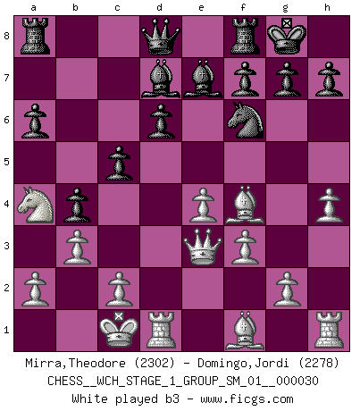 Last move : 1/2-1/2 2025 September 6 14:8:52 [Event "FICGS__CHESS__WCH_STAGE_1_GROUP_SM_01__000030"] [Site "FICGS"] [Date "2025.08.03"] [Round "1"] [White "Mirra,Theodore"] [Black "Domingo,Jordi"] [Result "1/2-1/2"] [WhiteElo "2302"] [BlackElo "2278"] 1.e4 e5 2.Nf3 d6 3.d4 exd4 4.Nxd4 Nf6 5.Nc3 Be7 6.Bf4 O-O 7.Qd2 Nc6 8.O-O-O Nxd4 9.Qxd4 a6 10.f3 b5 11.h4 c5 12.Qe3 b4 13.Na4 Bd7 14.b3 Bxa4 15.bxa4 Nd7 16.h5 h6 17.Bxd6 Bxd6 18.Rxd6 Qc7 19.Qd2 Rad8 20.Bxa6 Nb6 21.e5 Nxa4 22.Rd1 Ra8 23.Bc4 Nc3 24.e6 fxe6 25.Rxe6 Kh8 26.Rde1 Nxa2+ 27.Kb2 Nc3 28.Ra1 Rad8 29.Qe1 Nd5 30.Qe5 Qxe5+ 31.Rxe5 Nb6 32.Be6 c4 33.Ra6 Rb8 34.Kc1 Rfe8 35.R6a5 b3 36.Rab5 Red8 37.cxb3 cxb3 38.Bxb3 Nd7 39.Red5 Rxb5 40.Rxb5 Rb8 41.Rxb8+ Nxb8 42.Bf7 Nd7 43.Kd2 Ne5 44.Bg6 Kg8 45.Ke3 Kf8 46.Kf4 Nd7 47.Be4 Nf6 48.g4 Kf7 49.Bd3 Nd7 50.Kf5 Kg8 51.Be4 Nf8 52.Bd3 Nd7 53.Bc2 Nf8 54.Bb3+ Kh8 55.Be6 Nh7 56.Kg6 Nf8+ 57.Kf7 Nh7 58.Bd5 Nf6 59.Bc6 Kh7 60.Be4+ 1/2-1/2 Follow this game move after move (download)When your house is on fire, you can't be bothered with the neighbors. Or, as we say in Chess, if your King is under attack you don't worry about losing a Pawn on the Queen's side. (Gary Kasparov) Es ist wirklich schade, dass so viele Schachspieler nicht auf ihr Äußeres achten! (Alexandra Kosteniuk) El Ajedrez es un regaderazo frÃo para la mente. (Sir John Simon) On a dit que l'homme se distingue de l'animal par le fait qu'il achète plus de livres qu'il ne peut en lire. Je voudrais suggérer qu'inclure à la liste des livres quelques livres d'échecs rendrait la distinction manifeste. (Edward Lasker) Empty your mind, be formless, shapeless — like water. (Bruce Lee)