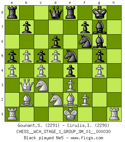 Last move : 1/2-1/2 2025 August 11 11:25:8 [Event "FICGS__CHESS__WCH_STAGE_1_GROUP_SM_01__000030"] [Site "FICGS"] [Date "2025.08.03"] [Round "1"] [White "Gounant,Stanislas"] [Black "Cirulis,Ilmars"] [Result "1/2-1/2"] [WhiteElo "2291"] [BlackElo "2290"] 1.b3 a5 2.c4 e5 3.e3 g6 4.a3 d6 5.Bb2 Bg7 6.d4 Nf6 7.Nf3 O-O 8.Be2 e4 9.Nfd2 h5 10.Nc3 Re8 11.h3 c6 12.b4 Bf5 13.b5 Nbd7 14.a4 c5 15.d5 g5 16.g4 hxg4 17.hxg4 Bg6 18.Qb3 Ne5 19.Rg1 Kf8 20.O-O-O Ke7 21.Rdf1 Rh8 22.Nd1 1/2-1/2 Follow this game move after move (download)Pawns: they are the soul of this game, they alone form the attack and defense. (Philidor) Immer nach dem besten Zug zu suchen ist ziemlich unpraktisch. (Nigel Short) La mitad de las variaciones que son calculadas en una partida de torneo, resultan ser completamente superfluas. Desafortunadamente, nadie sabe por adelantado cual mitad. (Jan Tinman) La tactique est l'élément le plus important du milieu de jeu. (Siegbert Tarrasch) Only sick music makes money today. (Friedrich Nietzsche)