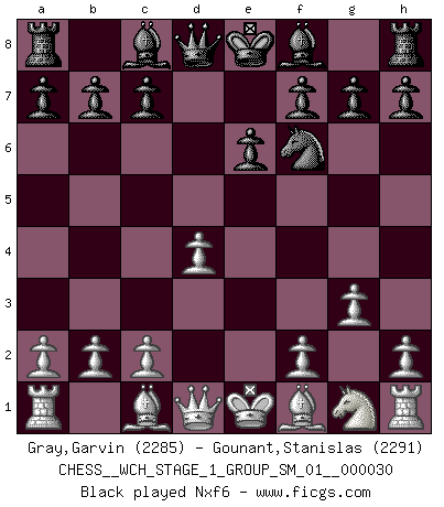 Last move : 1/2-1/2 2025 September 13 13:5:17 [Event "FICGS__CHESS__WCH_STAGE_1_GROUP_SM_01__000030"] [Site "FICGS"] [Date "2025.08.03"] [Round "1"] [White "Gray,Garvin"] [Black "Gounant,Stanislas"] [Result "1/2-1/2"] [WhiteElo "2285"] [BlackElo "2291"] 1.e4 e6 2.d4 d5 3.Nd2 dxe4 4.Nxe4 Nd7 5.g3 Ngf6 6.Nxf6+ Nxf6 7.Bg2 e5 8.Nf3 exd4 9.Qxd4 Be7 10.Bf4 c6 11.Qxd8+ Bxd8 12.Bd6 Ne4 13.Ba3 Ba5+ 14.c3 Bb6 15.O-O Be6 16.Rae1 f5 17.Nd4 Bxd4 18.Bxe4 fxe4 19.Rxe4 Kf7 20.Rxd4 Rhd8 21.Rfd1 1/2-1/2 Follow this game move after move (download)If a ruler does not understand Chess, how can he rule over a kingdom ? (King Khusros II) Der vorletzte Fehler gewinnt. (Savielly Grigorievitsch Tartakower) El estómago es una parte esencial del maestro de Ajedrez. (Bent Larsen) Le temps de noter son nom sur la feuille de partie, j'étais déjà en zeitnot ! D'un modeste amateur apparié lors de la première ronde d'un open contre le grand-maître Azmaïparashvili. I know the human being and fish can coexist peacefully. (George W. Bush, Saginaw sept. 29, 2000)